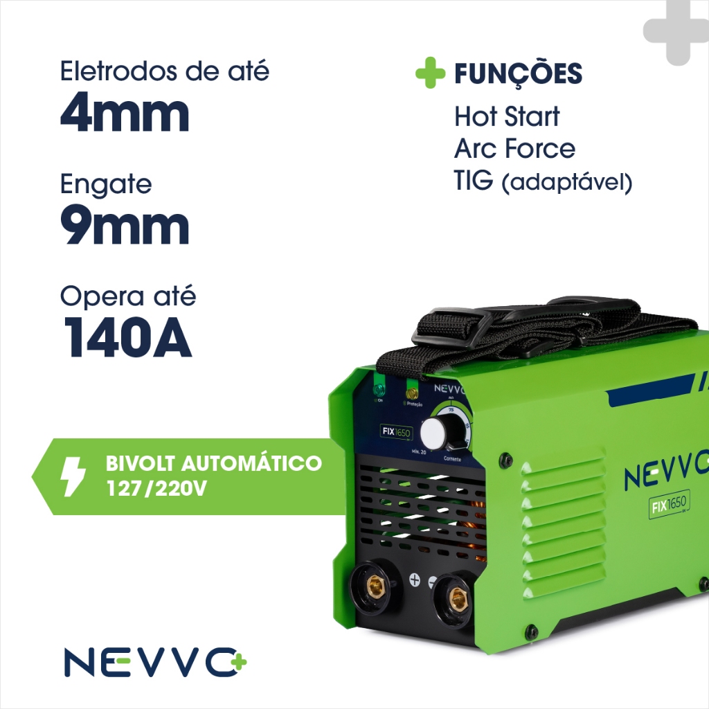A máquina de solda Fix1650 da Nevvo conta com garantia total de ATÉ 1 ANO, sendo 6 meses de garantia padrão e mais 6 meses adicionais mediante ativação gratuita da garantia estendida. AS INSTRUÇÕES PARA ATIVAÇÃO ACOMPANHAM O PRODUTO NA EMBALAGEM. O que vem na caixa: • Máquina de Solda Fix1650 • Cinta Tira Colo • Porta Eletrodo • Garra de Aterramento A FIX 1650 BV da Nevvo é uma inversora robusta e versátil, ideal para serviços com eletrodo revestido e solda TIG com tocha valvulada. Conta com ajuste preciso de corrente, sistema de proteção contra superaquecimento e é compatível com redes 110V e 220V. Projetada para aplicações em manutenção, serralheria, montagens e uso profissional leve. Especificações Técnicas • Modelo: FIX 1650 BV • Processos de solda: Eletrodo Revestido (MMA) e TIG (tocha valvulada) • Tensão de alimentação: Bivolt automático (110V / 220V) • Tensão em vazio: 80V • Faixa de ajuste de corrente: 20A a 140A • Arcforce: Sim, integrado, não é ajustável • Hotstart: Sim, integrado, não é ajustável • Antistick: Sim • Classe de proteção: IP21S • Sistema de refrigeração: forçada • Sistema de proteção térmica: com LED indicador Ciclo de Trabalho MMA: • 127V: 120A @ 35% - 92A @ 60% - 71A @ 100% • 220V: 140A @ 20% - 81A @ 60% - 63A @ 100% Recursos e Benefícios • Bivolt automático: Compatível com 127V e 220V sem necessidade de chave seletora • Tecnologia na palma na mão: Arcforce, Hotstart e Antistick. • Controle de amperagem: Regulagem precisa por potenciômetro no painel • Proteção térmica ativa: LED acende ao detectar superaquecimento; o ventilador permanece ligado para resfriamento seguro • Indicador de energia: LED frontal informa quando o equipamento está energizado • Leve, portátil e com alça de transporte: Ideal para deslocamentos e trabalhos em campo • Suporta soldagens em diferentes espessuras de chapa, inclusive multicamadas com chanfro