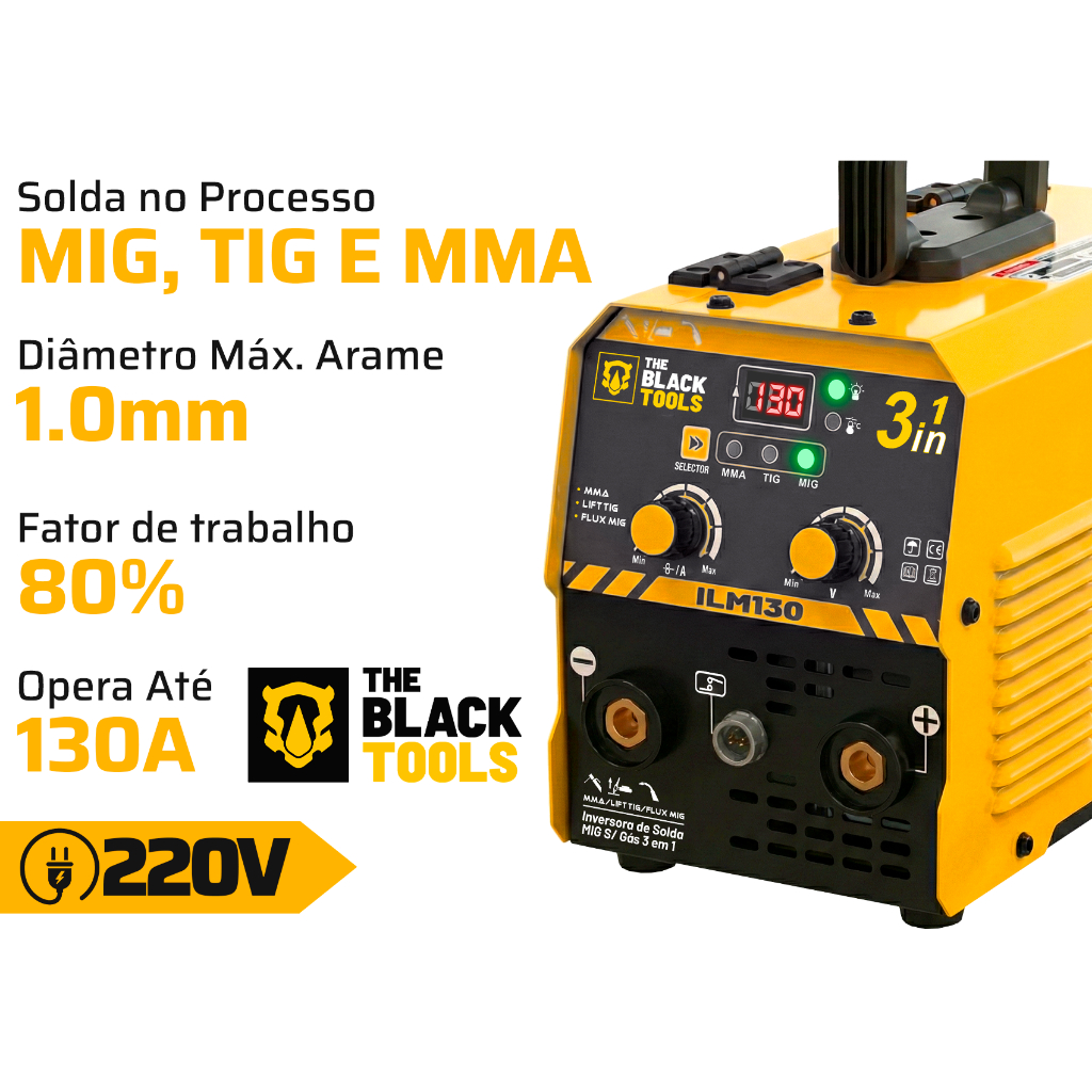Máquina Inversora Mig 130a Sem Gás 3 Em 1 Tig Lift Mma Eletrodo Ilm130 220V Mig The Black Tools