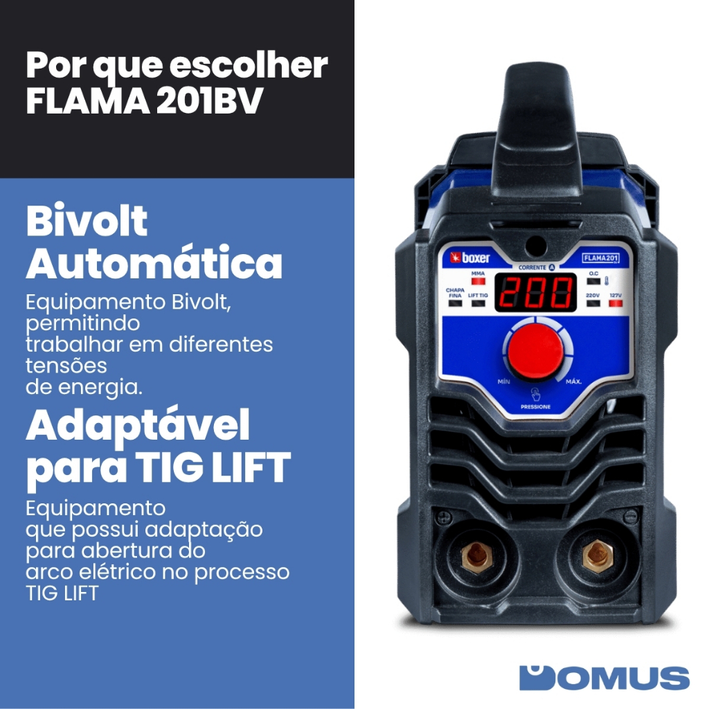 PRODUTO PRONTA ENTREGA COM ENVIO IMEDIATO Inversor de Solda FLAMA201BV Bivolt DC – Boxer | Desempenho robusto e confiável para soldagens com eletrodo revestido Descrição do produto O Inversor de Solda FLAMA201BV da Boxer é um equipamento portátil, potente e confiável, ideal para profissionais que atuam em serralherias, oficinas, manutenção predial e serviços de campo. Compacto e leve, oferece mobilidade sem abrir mão da performance. Com tecnologia DC (corrente contínua), é compatível com diversos tipos de eletrodo revestido, como E6013 e E7018, garantindo soldas com boa penetração e acabamento limpo. Sua operação é simples, com painel intuitivo e ajuste de corrente de até 200A, permitindo lidar com uma ampla gama de espessuras de metais. O modelo possui ventilação forçada e proteção térmica, assegurando segurança e durabilidade mesmo em jornadas intensas. Por ser bivolt automático, adapta-se facilmente a diferentes ambientes de trabalho. Perfeito para trabalhos de manutenção, montagem de estruturas metálicas, grades, portões, suportes e demais aplicações comuns em construção civil, mecânica e agroindústria. Destaques do produto Inversor de solda com corrente contínua (DC) para maior estabilidade do arco Bivolt automático: versatilidade para uso em 127V ou 220V Corrente ajustável até 200A para diferentes espessuras de metal Compatível com eletrodos E6013, E7018, entre outros Leve, compacto e com alça para transporte facilitado Ventilação forçada e proteção contra sobreaquecimento Ideal para serralheiros, técnicos de manutenção, instaladores e profissionais autônomos Informações técnicas Modelo: FLAMA201BV Boxer Voltagem: Bivolt automático (127V/220V) Tensão em vazio: - 127v: 72V; - 220V: 62V Corrente de saída: até 200A Tipo de solda: MMA e TIG DC Frequência: 50 Hz/60 Hz Refrigeração: Forçada Classe de isolação: F Tipo de proteção: IP21S Peso aproximado: 5,2 kg Conteúdo da embalagem 1 Inversor FLAMA201BV 1 Cinta tira-colo 1 Cabo garra de aterramento 1 Cabo porta eletrodo 1 Manual do usuário Produto original com garantia Garantia de 12 meses pelo fabricante Mais potência, menos peso e maior versatilidade. A escolha certa para quem vive da solda é Boxer.
