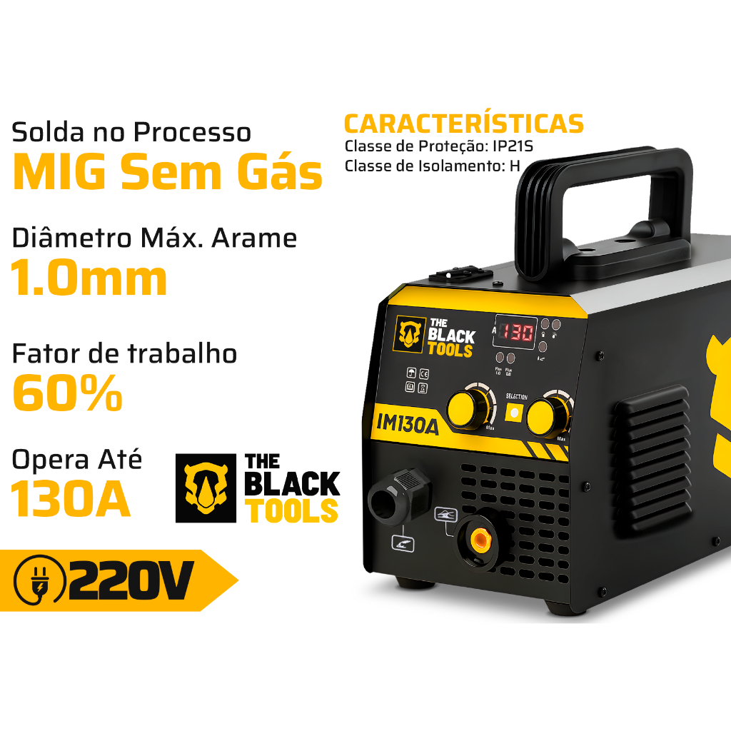 MÁQUINA DE SOLDA INVERSORA MIG SEM GÁS 130A 220V BLACK MIG IM130A - The Black Tools A Inversora de Solda IM130A da The Black Tools é uma máquina compacta, prática e eficiente, ideal para uso hobby e profissional. Com tecnologia IGBT, permite soldagens no processo MIG sem gás, oferecendo desempenho estável, ótimo acabamento e facilidade de operação. Seu painel digital facilita o ajuste da corrente e velocidade do arame, garantindo resultados precisos e consistentes. VANTAGENS: Design robusto com ventilação eficiente e proteção contra superaquecimento Compacta e leve, ideal para transporte e uso em diferentes ambientes Soldagem estável com excelente penetração e acabamento Compatível com geradores e cabos de extensão longos Tecnologia IGBT para melhor desempenho e eficiência Solda MIG sem gás em um único equipamento Painel digital de fácil ajuste e leitura ESPECIFICAÇÕES TÉCNICAS: Corrente de entrada nominal: 12,8A (MIG) Arames compatíveis: 0,8mm e 1,0mm Tensão de alimentação: 220V AC Tensão de trabalho: 15,5 – 20V Corrente de saída: até 130A Processos: MIG sem gás Classe de isolamento: H Grau de proteção: IP21S Fator de potência: 0,73 Ciclo de trabalho: 25% Tensão em vazio: 60V Peso: 8,1 kg (aprox.) Frequência: 60Hz Eficiência: 85% APLICAÇÕES: Soldagem de estruturas metálicas, suportes e chapas finas Uso em canteiros de obra e serviços externos Oficinas, serralherias e metalúrgicas leves Manutenção e reparos em geral CONTEÚDO DA EMBALAGEM: 01 Inversora de Solda IM130A 01 Garra negativa 01 Tocha MIG 01 Manual MARCA & MODELO: Marca: The Black Tools Modelo: IM130A Sku: 25087