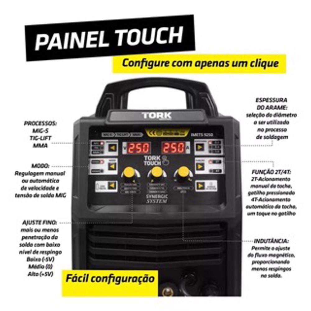 MÁQUINA DE SOLDA INVERSORA MIG MAG GÁS FLEX 250A TIG LIFT MMA A MELHOR TECNOLOGIA DE SOLDA DO MUNDO EM SUAS MÃOS! ✔ Indicada para profissionais e iniciantes ✔ 2 anos de garantia de fábrica A inversora de solda IMETS-9250-220V Super Tork Industrial foi projetada para modernizar e facilitar os trabalhos de solda. É um equipamento 3 em 1, capaz de realizar MIG-MAG, TIG-LIFT e MMA (eletrodo revestido). Na soldagem MIG-MAG é possível trabalhar com ou sem gás, e sua sinergia eletrônica garante facilidade de operação, mesmo para iniciantes. O modelo TOUCH 250S MAX possui processador de 32 bits (MCU) que otimiza a potência e amplia as regulagens. A tecnologia IGBT reduz o consumo de energia e entrega alta performance, enquanto seu sistema de proteção térmica e refrigeração aumenta a segurança e produtividade. Com 2 anos de garantia (9 meses contratual + 3 meses legal + 12 meses adicional mediante cadastro), a linha Super Tork foi desenvolvida para tornar o trabalho mais rápido, seguro e confiável. RECURSOS PRINCIPAIS MIG-MAG com/sem gás (alta produtividade). TIG-LIFT (melhor acabamento em chapas finas). MMA (eletrodos revestidos). MCU 32 bits e sinergia eletrônica. Modos manual e automático (2T/4T). Ajustes: corrente, tensão, indutância (-10 ~ +10), seleção de gás. Solda diversos materiais: aço carbono, inox, ferro fundido, alumínio etc. Polaridade reversível para MIG sem gás. Proteções: sobreaquecimento, sobretensão, VRD, anti-stick e hot start. Alta refrigeração, display digital e estrutura reforçada com rodas. Acompanha tocha MIG 24, porta-eletrodo, garra terra, roldanas 0.6/0.8 e 0.8/1.0, manual e guia rápido. CICLO DE TRABALHO MMA: até 5,0mm (60%). TIG-LIFT: até 3,2mm (100%) / 4,0mm (60%). MIG: até 0,9mm (100%) / 1,0mm (80%). DADOS TÉCNICOS – IMETS-9250-220V Voltagem: 220V / Frequência: 50-60Hz Potência: 8.360W Corrente de entrada: MIG 29A | TIG 17A | MMA 27A Faixa de Amperagem: MIG 50–250A | TIG 20–200A | MMA 20–200A Tensão em vazio: 60V Capacidade alimentador: 5 a 20kg Conectores: 13mm + Euro Conector Dimensões: 308 x 585 x 510mm | Peso: 26kg VANTAGENS DE CADA PROCESSO MMA – Eletrodo revestido Mais versátil e acessível, solda praticamente qualquer material. Não exige grande habilidade e só utiliza o eletrodo como consumível. MIG-MAG Ideal para alta produção e longos períodos de solda. Possui acabamento superior, sem escória, com maior produtividade que MMA. Com gás: requer rolo de arame, cilindro e regulador de gás, tocha MIG. Sem gás: requer apenas rolo de arame e tocha MIG. TIG-LIFT Processo para acabamento perfeito: fusão limpa, sem respingos e sem retrabalho. Requer vareta de adição TIG, tungstênio, cilindro e regulador de gás, tocha TIG completa. QUAIS MATERIAIS SOLDAR? MMA: aço carbono, inox, ferro fundido, alumínio, metalon, carrocerias, estruturas metálicas etc. TIG DC: aço carbono, inox, ferro fundido e outros metais ferrosos. MIG-MAG com gás: aço carbono, inox, alumínio, ferro fundido etc. MIG sem gás: aço carbono, ferro fundido, chapas automotivas e estruturas metálicas. A IMETS-9250-220V Super Tork é a solução completa em soldagem para quem busca desempenho, praticidade e confiabilidade no dia a dia profissional.