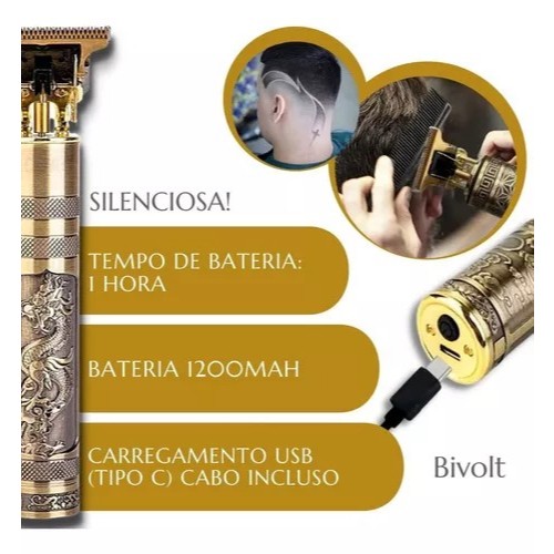 Modelo sem fio, possui bateria recarregável em uma entrada USB. A máquina é fácil de manipular e possui uma bateria de alta duração com 1200mah que lhe dá uma autonomia de 2 horas de uso. Ela é perfeita para profissionais da área, possui um motor potente de 5w. Aguenta o trabalho duro do dia a dia. Serve para fazer pezinho, desenhos e detalhes. Este modelo vinha sendo bem procurado por nossos clientes devido ao seu design todo em metal e chamativo, possui a estampa da um Dragão na frente. É perfeito para profissionais que atuam em Barbearias, salões que queiram se destacar com uma ferramenta diferenciada e uso doméstico, para quem goste de praticidade e precisa manter uma boa aparência constante. Esta máquina possui qualidade e mais funcionalidades que muitas outras de marcas conhecidas, que custam o dobro, ou três vezes mais. - Acompanha 4 (quatro) pentes guia para você começar a praticar seus cortes! - Totalmente recarregável em qualquer entrada USB - 2 Horas de carga - Potência: 5W - Tamanho: 14,8 x 2,5 cm modelo de buda e cabeça: com pentes: 1.5mm, 3mm, 2mm, 4mm. Escovinha de limpeza
