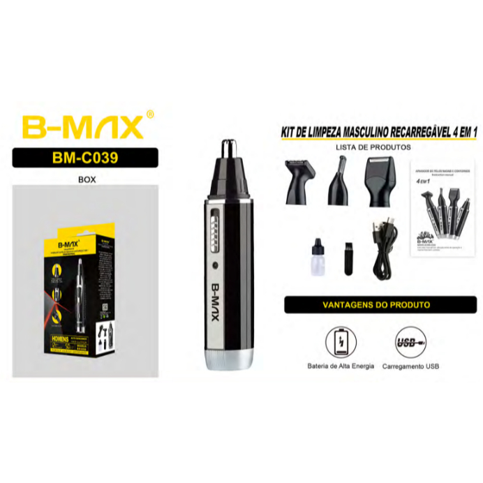 Maquininha s/fio recarregável Bivolt B-MAX 4 em 1 aparador de pelos do nariz Modelo BM-C039 - Bateria recarregável Tipo de depilador Aparador de pelos Quantidade de aparador 1 Descrição Preparação Total na palma de suas mãos! BM-C039 Aparador de Pelos é um 4 em 1 multi-funcional ferramenta elétrica para aparar a barba, costeletas, nariz, buço e também o cabelo da sobrancelha. Ele permite que troque a cabeça para função desejada! e manter as lâminas em estreita entre em contato com o seu rosto, garantindo menor irritação e um preciso fazer a barba. Especificação: Marca: B-MAX Modelo Número: BM-C039 Tamanho: 12,5X2,5X2,5cm Alimentação: Recarregável Tempo de Carga: 10 - 12 horas Tempo de uso: Até 60 Min Material: ABS + Metal Com corte dispositivo: Sim Tensão: USB 5v Característica: única lâmina Cor: preta Função: -Função 1: aparador de pelos no nariz -Função 2: função recorte -Função 3: Aparador de Sobrancelha -Função 4: aparador de barba