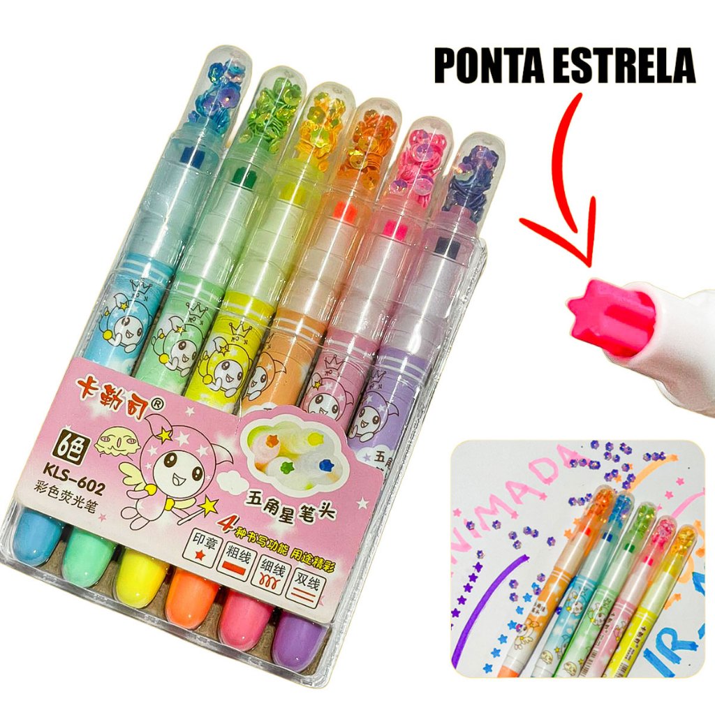 Marca Texto fofo e Barato Kit de 6 Ponta em Formato Estrela Carimbo Tampa Lantejoulas Cores Neon
