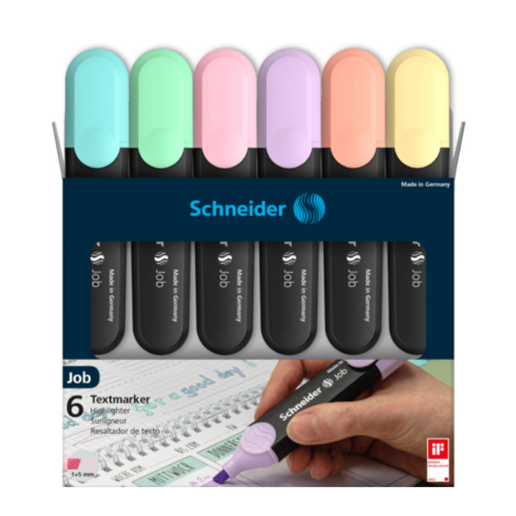 Estojo com 6 marca-texto tom pastel com ponta chanfrada de 1mm a 5mm e as seguintes cores : Azul pastel, Verde pastel, Laranja pastel, Rosa pastel, Amarelo pastel e Lilás Pastel. A tinta universal apresenta brilho máximo e boa resistência à luz em papel. O marcador Job apresenta um desempenho brilhante e recebeu o renomado prêmio IF e Red Dot Design em 2013. A forma mais fina com bordas arredondadas é perfeita para guardar no bolso ou no estojo. A tampa tem um clipe que se encaixa perfeitamente. Com seu grande reservatório de tinta, a o marcador Job pode destacar mais de 15.000 palavras.
