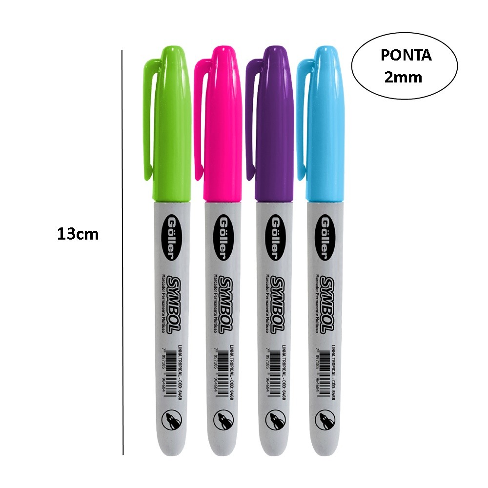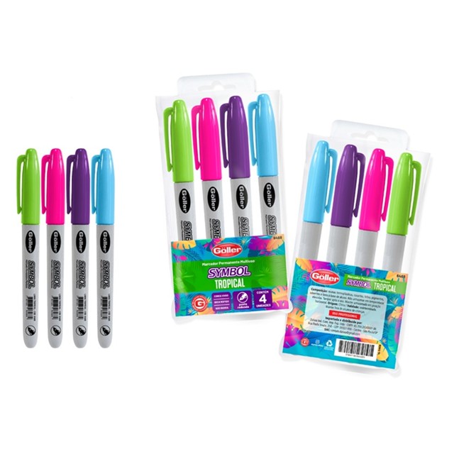 KIT COM 4 MARCADORES PERMANENTE COM CORES TROPICAL Os marcadores permanentes usam tintas similares a do spray, que são resistentes a água e aderem a quase todas superficies lisas e não porosas. Os marcadores permanentes da Göller completam 20 anos no mercado. Multiuso Ideal Para Marcar: Vidro Metal Papelão Plástico Madeira cerâmica Ponta: 2,00mm Altura: 13cm