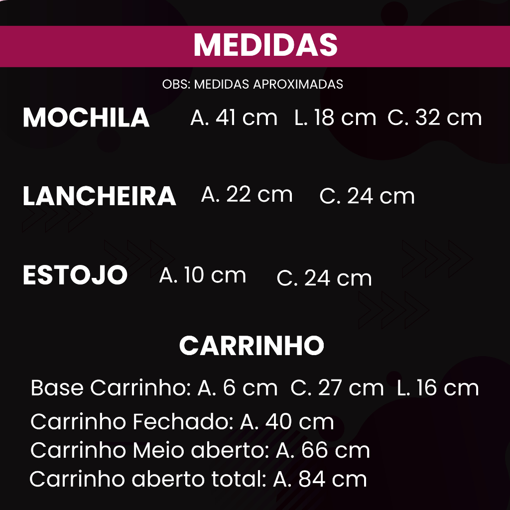 Características: - Alça superior - Estampa no bolso frontal Medidas Mochila: - Altura: 41cm - Largura: 15cm - Comprimento: 32cm Medidas Lancheira: - Altura: 22cm - Largura: 24cm Medidas Estojo: - Altura: 11cm - Comprimento: 23cm