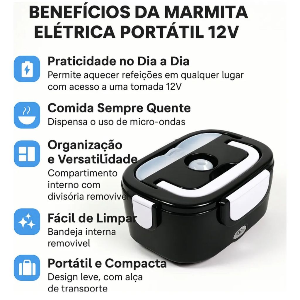 Marmita Elétrica Portátil 12V com Divisória – Ideal para Viagens e Trabalho Mantenha suas refeições sempre quentinhas onde quer que esteja com esta marmita elétrica portátil 12V! Com design moderno em preto e branco, ela conta com alças laterais resistentes, tampa com vedação segura, válvula de vapor e divisória interna removível para separar alimentos. Acompanha cabo de alimentação veicular, ideal para uso no carro, caminhão ou outros veículos com entrada 12V. Perfeita para motoristas, viajantes e trabalhadores em movimento! Destaques do produto: Compatível com tomada 12V (veicular) Tampa com válvula de vapor e compartimento para talher Divisória interna removível para separar os alimentos Aquece a comida uniformemente e com segurança Design compacto, leve e fácil de transportar Material resistente - todo em plástico Não necessita de água para aquecer Inclui: 1 x Marmita elétrica portátil 1 x Cabo de alimentação 12V 1 x Cabo alimentação bivolt 1 x Colher plástica Garantia do vendedor: 30 dias *NÃO COLOCAR ÁGUA.