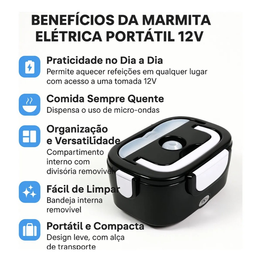 Apresentamos a Marmita Térmica Elétrica Portátil 110v/220v Veiculo 12v/24v - Capacidade 1,5L. Ideal para quem precisa de praticidade, agilidade e conforto. Este modelo compacto e prático comporta até 1,5L de alimentos, permitindo que você leve seu almoço ou jantar completo para onde for. Pode ser usada tanto no seu carro ou caminhão através da saída 12V/24V, quanto em casa ou no trabalho através da tomada 110V/220V. Foi projetada para o seu conforto, solucionando o problema de aquecimento de forma rápida e eficaz. ESPECIFICAÇÕES DO PRODUTO Capacidade: 1,5 L Medidas: Largura 11 CM / Altura 11 CM / Comprimento 23,5 CM Tensão: 12V/24V (veículo) e 110V/220V (tomada convencional) Cabo para utilização em tomada 12V/24V para veículos e tomada convencional 110V/220V para casa, trabalho etc; Potência: 40W Peso: 550 gramas Repartições para separação de alimentos; Suporte de talheres; PRECAUÇÃO IMPORTANTE Pressione a válvula de silicone localizada no centro da tampa antes de aquecer, caso esqueça de abri-la, o vapor interno irá danificar a sua marmita podendo inutilizar o produto. MODO DE USO 1 - Coloque os alimentos prontos dentro da marmita elétrica; 2 - Aperte a parte em cima da tampa - (Válvula da saída de vapor); 3 - Abra a tampa do soquete e insira o cabo de alimentação; 4 - Ligue o cabo de alimentação, a luz indicadora irá acender; O tempo de aquecimento depende da quantidade de comida da marmita eletrica newness digital lens leva cerca de 25 a 30 minutos para aquecer o alimento dependendo da temperatura interna em que o mesmo se encontra. DICAS DE SEGURANÇA - Não utilize água para aquecer a comida na parte inferior da marmita, pois este modelo não é adequado para banho-maria. - Se o cabo de alimentação estiver danificado, é possível substituí-lo por qualquer cabo com a mesma entrada da lancheira. - Não aqueça a lancheira no forno de micro-ondas, pois pode derreter. - Não ligue a lancheira quando não houver comida. - Não congele a lancheira. Somente o pote plástico e a tampa deve ficar na geladeira, a base da marmita não, pois possui componentes eletrônicos. - É proibido mergulhar a parte inferior da lancheira (a parte de metal) em água para limpeza. Se necessário, utilize apenas um pano úmido. - É proibido desinfetar a lancheira em uma cabine de esterilização de alta temperatura BENEFÍCIOS - Não perca mais tempo comendo comida fria. - Esquente a comida enquanto trabalha ou dirige. - Possui divisórias para os alimentos. - Design moderno e elegante. CONTÉM: - Marmita Elétrica Bivolt - Manual de instrução - Cabo para Tomada Convencional - Cabo para Carro 12v/24v - 1 Colher
