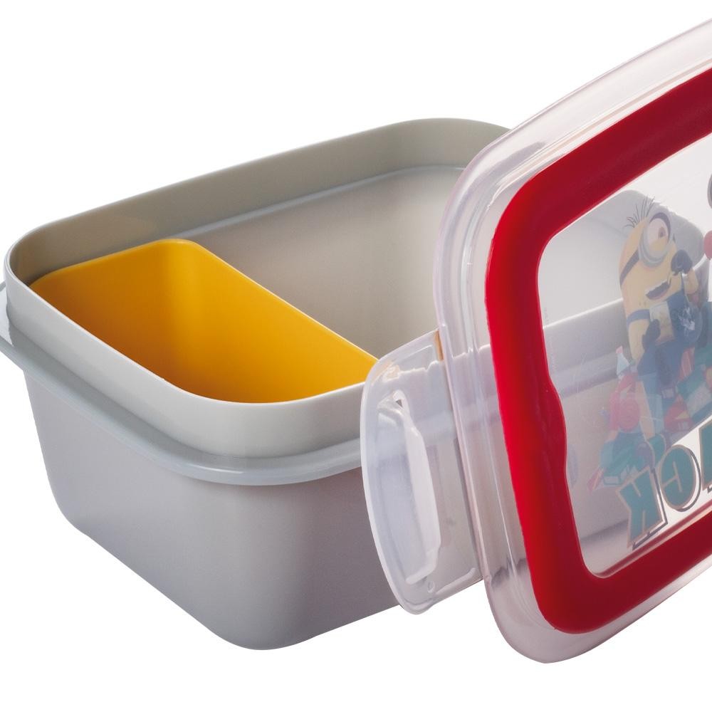 Marmita Hermética Lancheira Meu Malvado Favorito Plasútil Dimensao: (Comp x Larg x Alt): 15,4x11,6x6,8 cm Capacidade: 630,0 ml - A marmita hermética de 630 ml possui tampa emborrachada, com isso, os alimentos ficam até 3x mais conservados: a borracha impede a troca de ar com o ambiente externo, além de evitar vazamento. - As travas laterais garantem um fechamento seguro. - Com a divisória removível é possível organizar dois tipos de lanche/alimentos em um único recipiente, otimizando espaço na lancheira ou bolsas térmicas e de passeio. - Fabricado em plástico polipropileno (PP). Atóxico e livre de bisfenol-A (BPA FREE). - Pode ser levado ao micro-ondas e freezer. - Decoração injetada no plástico, não adesivada: segurança aos pequenos..