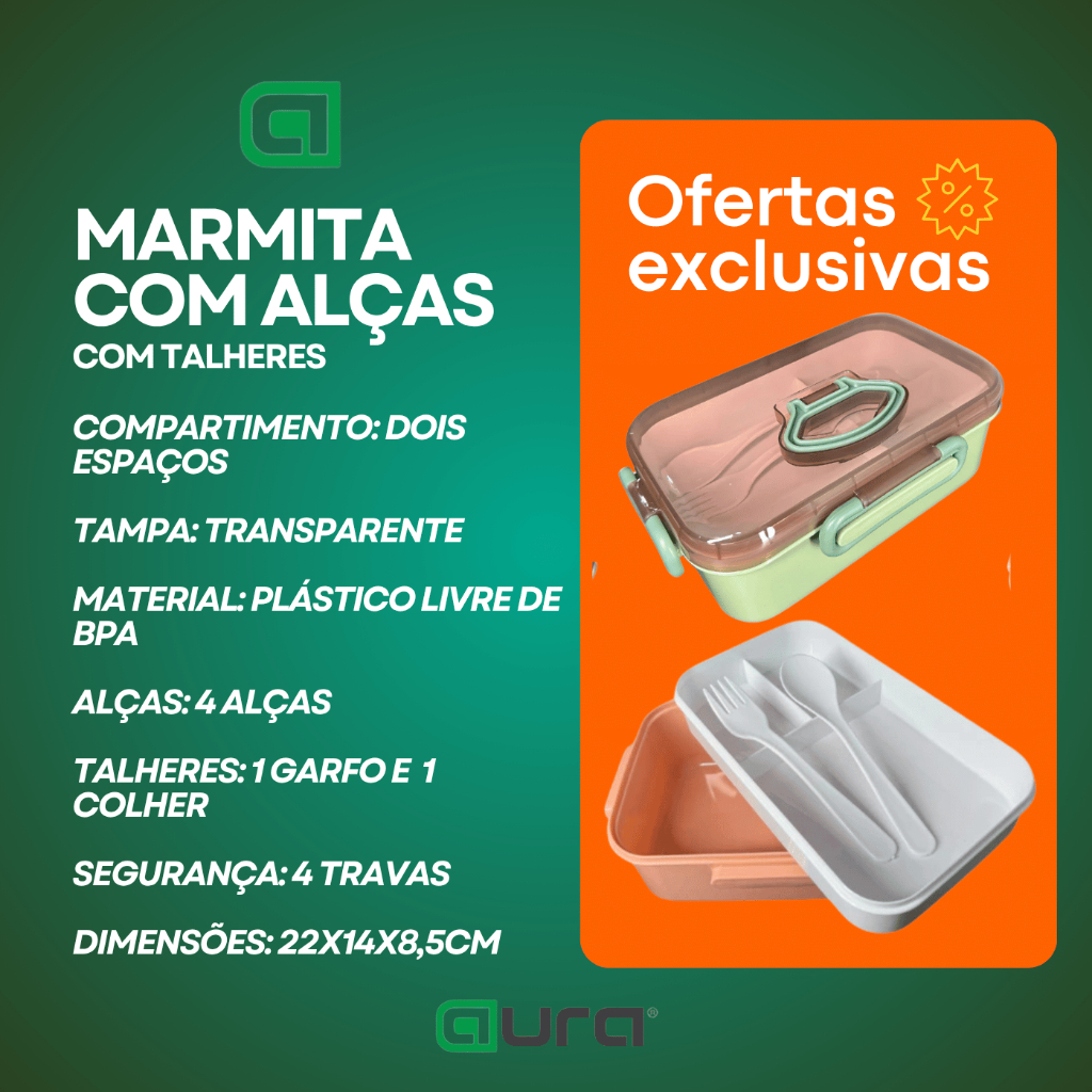 Marmita Lancheira com 2 Compartimentos e Talheres - Ideal para Adultos e Crianças Prática, funcional e versátil, a Marmita Lancheira com 2 Compartimentos é perfeita para organizar suas refeições de forma prática e segura, seja para o trabalho, escola ou para levar para passeios. Com design moderno e compacto, ela atende tanto adultos quanto crianças, garantindo que suas refeições sejam mantidas frescas e bem conservadas. Características: Design Compacto e Funcional: Com 2 compartimentos, facilita o armazenamento e transporte de diferentes alimentos separadamente. Material Seguro e Durável: Fabricada em plástico de alta qualidade, livre de substâncias prejudiciais à saúde, ideal para uso diário. Praticidade no Dia a Dia: Produto próprio para micro-ondas, podendo aquecer suas refeições com segurança. Talheres Inclusos: Acompanha talheres ecológicos, práticos e reutilizáveis, perfeitos para levar junto na lancheira. Vedação Eficiente: Sistema hermético que garante a vedação ideal, evitando vazamentos e mantendo a temperatura por mais tempo. Especificações: Material: Plástico de alta qualidade e seguro para alimentos Peso: Leve e fácil de carregar Dimensões: Compacta para facilitar o transporte Cores disponíveis: Diversas opções para agradar tanto adultos quanto crianças Ideal Para: Refeições no trabalho, escola ou passeios Organizar diferentes tipos de alimentos de maneira prática Quem busca uma opção ecológica e reutilizável para o dia a dia Leve praticidade e organização para o seu cotidiano com a Marmita Lancheira com 2 Compartimentos e Talheres!