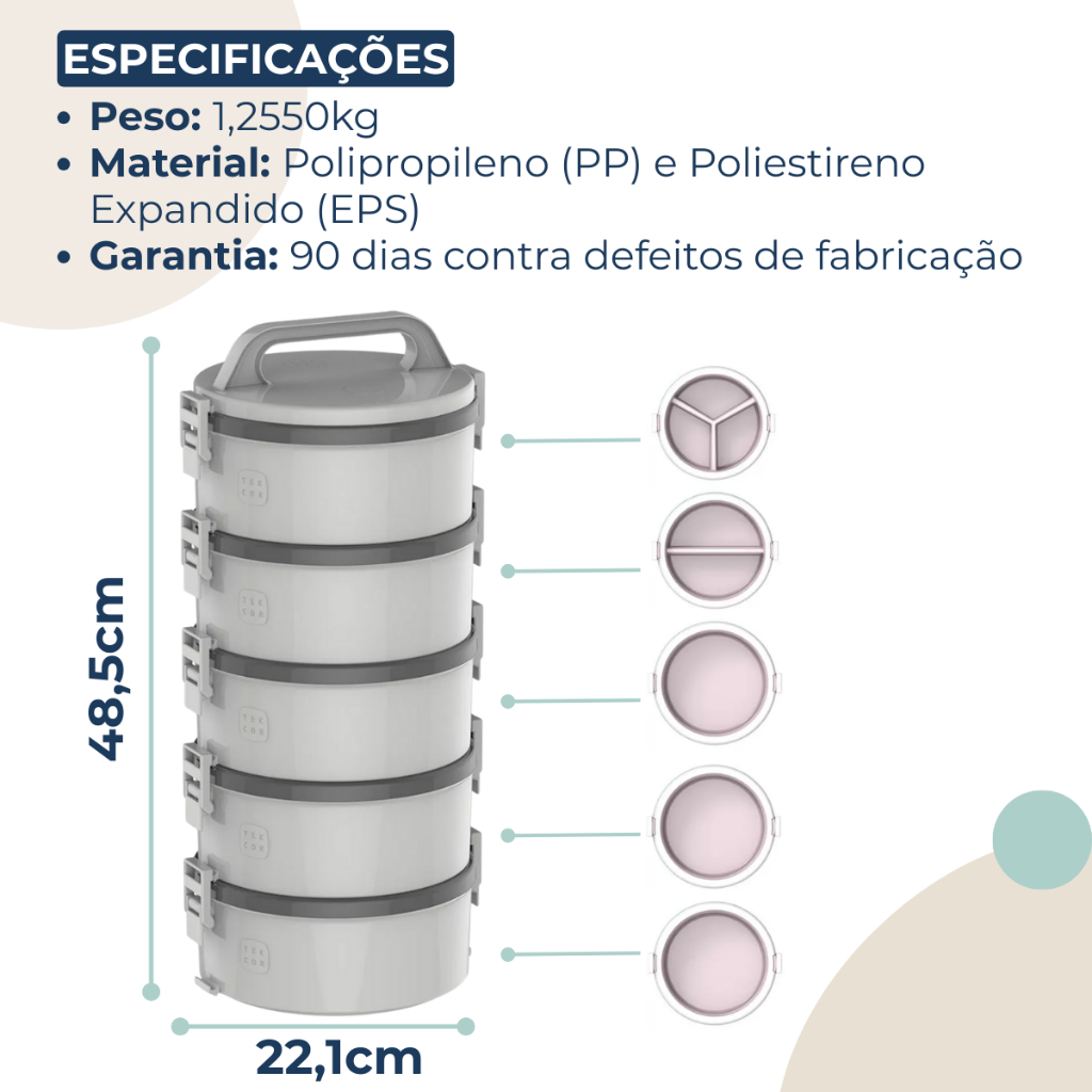 SOBRE O PRODUTO A mais tradicional e popular marmita do mercado, atendendo suas necessidades na medida certa. Muito utilizada em ambientes corporativos, construção civil, agricultura ou até mesmo no dia a dia para buscar comida em restaurantes. Conserva os alimentos na temperatura ideal para consumo. Conjunto com 5 peças, ideal para transporte e alimentação de equipes. DIFERENCIAIS DO PRODUTO - Kit composto por: 3 marmitas sem divisão, 1 marmita com divisão dupla e 1 marmita com divisão tripla; - Presilhas para fechamento; - Alça robusta para transporte; - Pode ser utilizado no micro-ondas (sem a tampa); - Isolamento térmico em EPS; - BPA Free. CONTEÚDO DA EMBALAGEM - 3 marmitas sem divisão, 1 marmita com divisão dupla e 1 marmita com divisão tripla. EFICIÊNCIA TÉRMICA - Quente: 4 horas - Frio: 4 horas ESPECIFICAÇÕES TÉCNICAS - Capacidade: 5 compartimentos de 1,5 litros cada - Dimensões do produto: 22,1x20,3x48,5cm - Peso: 1,2550kg - Material: Polipropileno (PP) e Poliestireno Expandido (EPS) - Garantia: 90 dias contra defeitos de fabricação