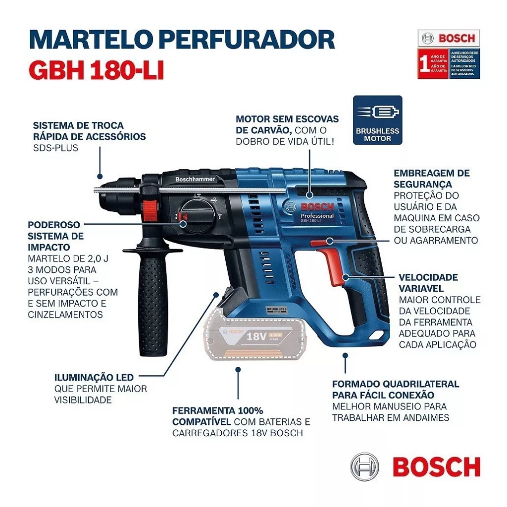 Martelete Perfurador Bosch A Bateria 18v 4ah Gbh 180-li Brushless Sem Carregador