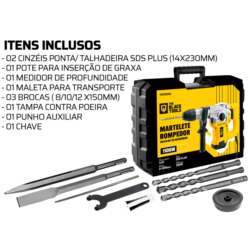 Distribuído por Ismafer Ferramentas Descrição: MARTELETE PERFURADOR E ROMPEDOR 1100W 1000RPM SDS PLUS TRM-2000 - The Black Tools Desenvolvido em material de alta performance e design moderno, pode ser usado em diferentes locais de trabalho. Possui mandril SDS Plus e seletor multifunção com 4 modos de operação: Furadeira - Rotativo, Martelete, Esculpir e Ajuste de Ângulo. Tem manopla ergonômica, leve e antiderrapante proporcionando o máximo de conforto em uso prolongado, furações, demolições, etc. Acompanha maleta de acondicionamento, ponteira, cinzel, brocas e acessórios em geral. VANTAGENS: - Sistema SDS Plus para troca rápida de acessórios; - Maleta completa com acessórios; - Potência profissional de 1100W; - Design ergonômico. ESPECIFICAÇÕES TÉCNICAS: - Modos: Rotativo, Martelete, Esculpir e Ajuste de Ângulo - Taxa de impacto: 4000 BPM / 4J; - Encaixe: SDS Plus (26mm); - Rotação: 0 - 1000 RPM; - Frequência: 50/60Hz; - Potência: 1100W. APLICAÇÕES: - Perfuração em concreto armado; - Instalações prediais; - Demolições leves; - Remodelações; - Obras civis. CONTEÚDO DA EMBALAGEM: - 01 Martelete Rompedor TRM-2000 The Black Tools; - 03 Brocas SDS Plus (8/10/12mm); - 01 Medidor de profundidade; - 01 Talhadeira 14 x 230 mm; - 01 Ponteira 14 x 230 mm; - 01 Maleta de transporte; - 01 Punho auxiliar; - 01 Pote de graxa; - 01 Manual; - 01 Chave. MARCA & MODELO: - Marca: The Black Tools - Modelo: TRM-2000 - Garantia de fábrica: 180 dias SKU: 24486 220v - 24485 127v Distribuído por Ismafer Ferramentas