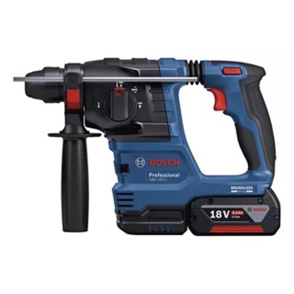 Martelo Perfurador Rompedor a bateria de 18V GBH 185-LIO martelete rompedor Bosch GBH 185-LI SB 18V é totalmente indicado para perfurações mais robustas por carga e potência, graças ao motor Brushless sem escovas de carvão. Conta com algumas tecnologias como o KickBack Control que reduz o risco de acidentes ao desligar instantaneamente a ferramenta em caso de travamento do acessório. Outra tecnologia que traz a ferramenta é o Vibration Control, que controla e reduz a vibração em até 50% nas mãos do operador. Tudo isso para garantir mais conforto e segurança! O martelete rompedor Bosch GBH 185-LI SB é compatível com coletor de pó automático GDE 12 e permite um trabalho livre de sujeiras. Indicado para uma série de atividades como montagem de paines, instalações e fixação de prateleiras.Nº de rotações rpm - Mínimo e Máximo 0-1800Diâmetro max. perfuração concreto (mm) 22Diâmetro max, perfuração concreto broca maciça (mm) 22Diâmetro max. perfuração madeira (mm) 20Diâmetro max. perfuração aço (mm) 13Acompanha:2 baterias de 4,0 Ah,1 carregador GAL 1840,1 manual de instruções da ferramenta,1 manual de instruções do carregador,1 empunhadura auxiliar,1 limitador de profundidade1 maleta