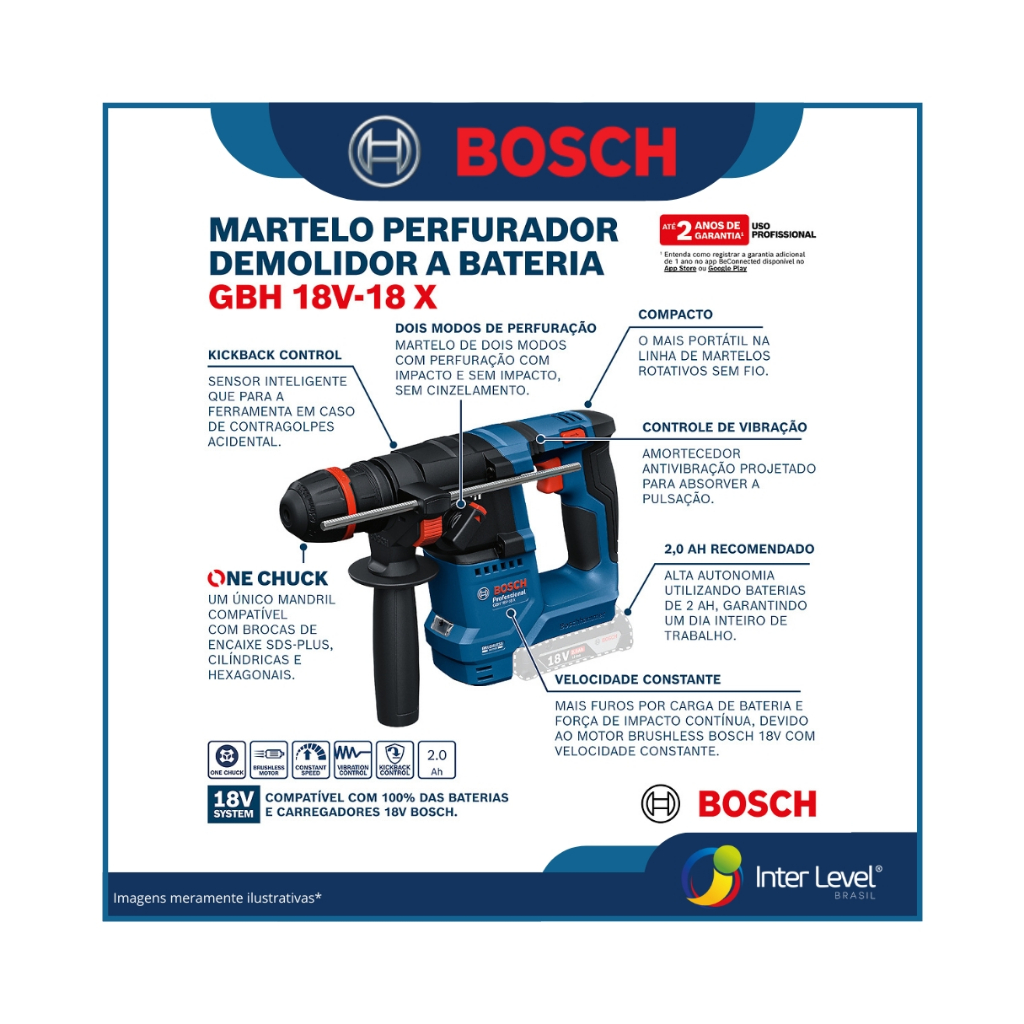 Martelete Rompedor SDS Plus Gbh 18v 18 X Brushless Bosch ATENÇÃO: NÃO ACOMPANHA BATERIA / CARREGADOR / MALETA / BOLSA. --- Descrição — - Cansado de trocar ferramentas para perfurar diferentes materiais? - O martelo perfurador profissional Bosch GBH 18V-18 X é a ferramenta ideal para si. - Compacto, mas poderoso, este martelo sem fio vem com ONECHUCK, um mandril único que acomoda brocas SDS-plus, cilíndricas e hexagonais para uma ampla gama de aplicações, incluindo concreto, madeira e metal. O KickBack Control garante que o motor para imediatamente quando a broca fica presa no material, evitando lesões comuns por contragolpe. - O Vibration Control amortece as vibrações para reduzir a dormência das mãos e dos braços durante o trabalho. - Este martelo sem fio leve ainda oferece desempenho total com uma bateria de 18V 2.0 Ah, fazendo com que a potência extrema pareça mais leve em suas mãos. - Uma única carga de bateria é suficiente para fazer até 50 furos em concreto, graças ao seu robusto motor sem escovas com potência contínua e velocidade constante. - Equipamento e aplicação - - O martelo perfurador Bosch GBH 18V-18 X Professional é ideal para profissionais como instaladores de armários, carpinteiros, vidraceiros e gerentes de instalações que trabalham com concreto, madeira e metal. - É o martelo sem fio Bosch Professional mais leve da gama de 18 V e oferece desempenho total com apenas uma bateria de 18 V 2,0 Ah (Não acompanha bateria). - Informações adicionais - - O martelo perfurador Bosch GBH 18V-18 X Professional vem com um motor robusto sem escovas e com ONECHUCK que acomoda brocas SDS-plus, cilíndricas e hexagonais, portanto, pode ser usado para perfuração com impacto em concreto e perfuração de madeira ou metal. - Também possui KickBack Control e Vibration Control. - Máxima flexibilidade com um único mandril compatível com brocas SDS-plus e cilíndricas/hexagonais, permitindo o uso em diversas aplicações com o mesmo Martelete. - O motor sem escovas de carvão garante velocidade constante, mais furos por carga e energia para um dia inteiro de trabalho - Trabalhe com mais confiança graças ao sensor de proteção contra contragolpes e ao sistema de amortecimento incorporado que reduz a vibração. - Leve seu Martelete perfurador para qualquer lugar; seu design compacto foi projetado para caber em qualquer mala de ferramentas. - Ideal para perfuração com e sem impacto em uma ampla gama de materiais, incluindo concreto, madeira e metal. --- Dados Técnicos --- • Voltagem da bateria: 18,0 V; • Energia de impacto: 1,5 J; • Suporte da ferramenta: SDS plus, Cilíndrico (eixo máx. 10 mm), Hexagonal (eixo máx. 10 mm) • Energia de impacto nominal: 1,5 J. - Faixa de perfuração - • Diâ. de perfuração em concreto com brocas para martelo 4 – 18 mm; • Faixa apl. opc. em concreto com brocas para martelo 6 – 10 mm. - Valores totais de vibração(Perfuração com percussão em concreto) - • Valor de emissão de vibrações ah: 17 m/s²; • Incerteza K: 1,5 m/s². - Perfuração com percussão em concreto - • Valor de emissão de vibrações ah: 17 m/s²; • Incerteza K: 1,5 m/s². --- Dimensões — - Do Produto - • Altura: 21 cm; • Largura: 11 cm; • Comprimento: 29 cm • Peso: 1,874 Kg. - Da Embalagem - • Altura: 21,5 cm; • Largura: 14 cm; • Comprimento: 30,5 cm; • Peso: 2,283 Kg. --- Composição da Embalagem — • 1 Martelete GBH 18V 18 X; • 1 Punho Auxiliar; • 1 Manual. — Perguntas Frequentes — O produto é original? Sim, pirataria é crime e deve ser denunciado à Shopee. Acompanha Nota Fiscal? Sim. O produto tem a garantia legal do fabricante? Sim. Consulte o campo garantia do anúncio. Estoque limitado – Garanta já o seu! Compre agora e aproveite nossas promoções especiais!