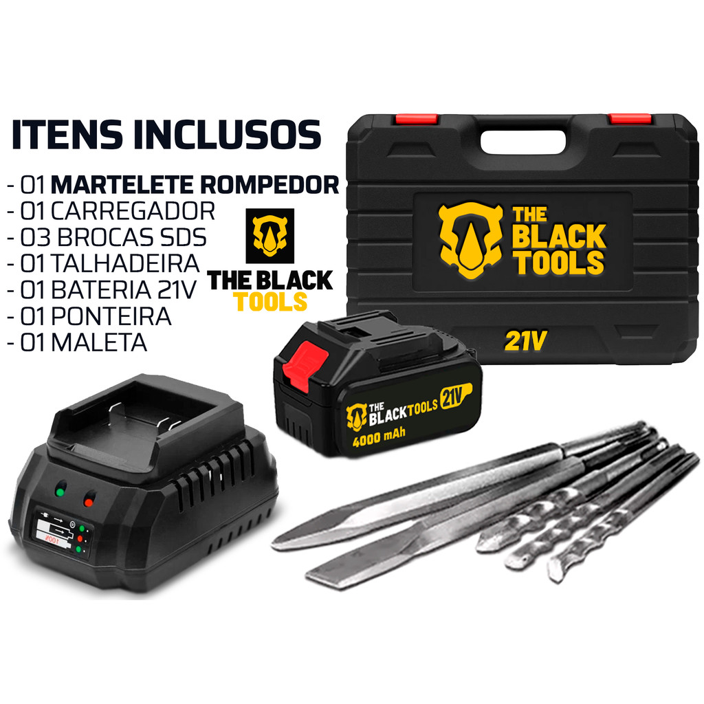 Martelete Rotativo Furadeira Impacto Brushless 2 Baterias 21v Com Acessórios The Black Tools
