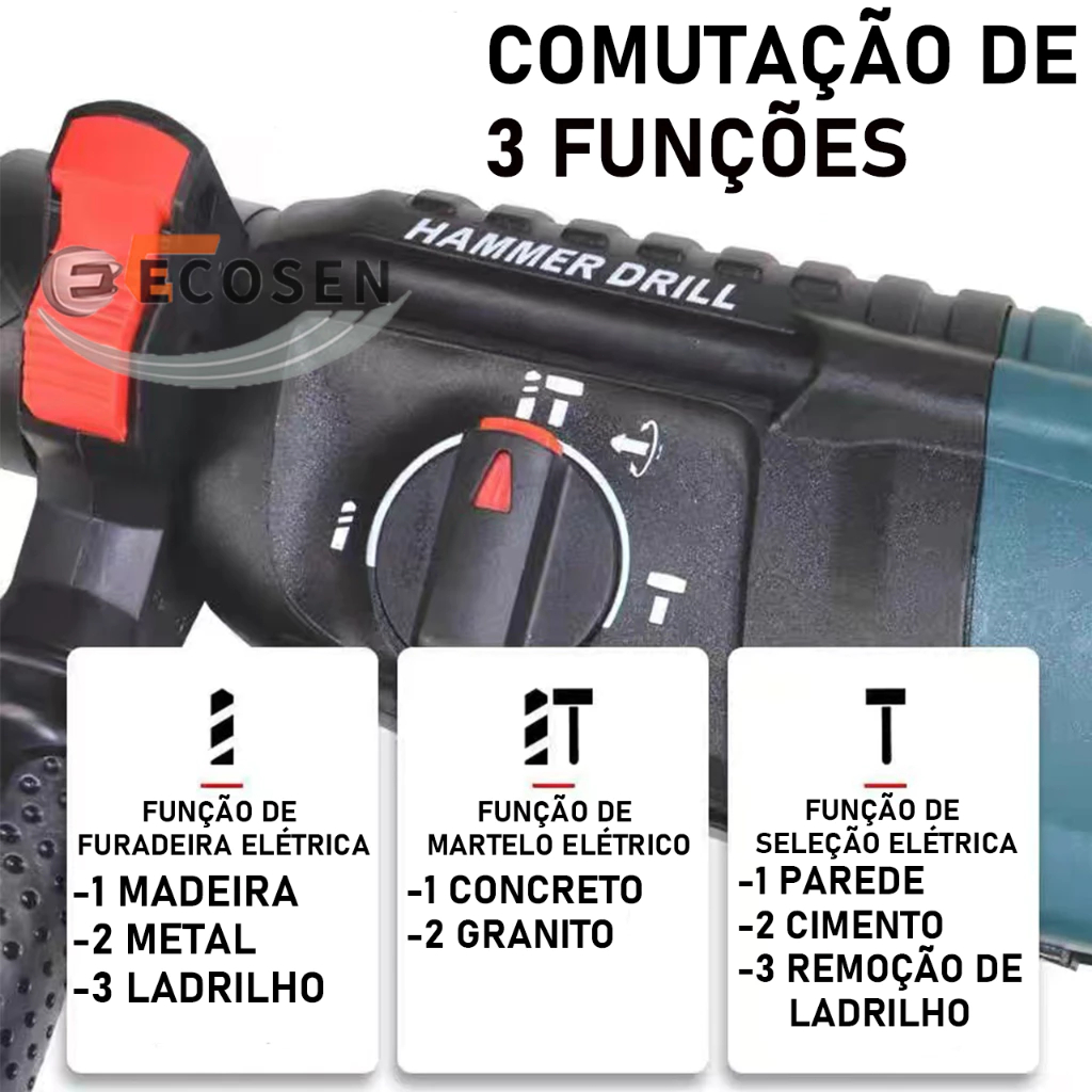 Martelete Rotativo Rompedor Parafusadeira e Furadeira de Impacto Potência de 800W 110V + Maleta Acessórios