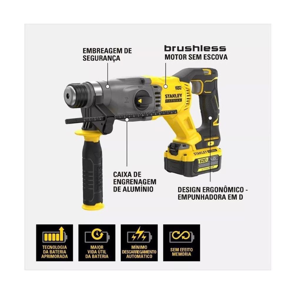 INCLUIMartelete Perfurador / Rompedor SDS-PLUS (22mm) 20V Max Íon de Lítio Brushless sem Bateria e Carregador SBH900 STANLEYSem Carregador, sem Bateria.-------------------------------------------------------------DADOS TÉCNICOSVoltagem Bateria: 20V MaxVelocidade (RPM): 1.500Impacto (IPM): 5.500Energia de impacto: 2.0J-------------------------------------------------------------CAPACIDADE DE PERFURAÇÃOMadeira: 40mmMetal: 13mmConcreto: 30mm-------------------------------------------------------------CARACTERÍSTICASMotor com sistema BRUSHLESS sem escova de carvão;Embreagem de segurança protege o usuário nas perfurações;3 modos de perfuração;Velocidade variável com função reversível;Punho ergonômico com revestimento de borracha;Encaixe de bateria deslizante;A linha V20 inclui ferramentas com motores brushless que utiliza um dispositivo eletrônico que altera continuamente a fase elétrica para manter o motor funcionando em vez de escovas de carvão. O sistema Brushless dá às ferramentas vantagens significativas em relação aos modelos com escova de carvão.MAIS POTÊNCIAOs motores sem escova não perdem energia por atrito ou calor, fornecendo mais potência para aplicações exigentes.MAIOR DURAÇÃOO controlador eletrônico, em vez de escovas de carvão, consome menos energia da bateria, permitindo que a ferramenta funcione por mais tempo em comparação a um modelo com escova de carvão.MOTOR COMPACTOAs ferramentas sem escova de carvão são mais compactas devido ao design menor do motor, tornando-as mais leves e fáceis de usar em aplicações de difícil acesso.