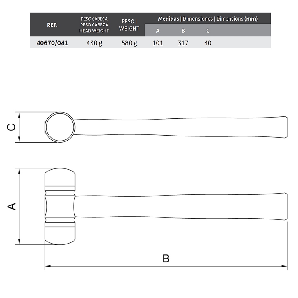 Martelo 40mm Tramontina PRO Borda em ABS 40670/041 Descrição do Produto: - Utilizados para golpear materiais que não podem ser danificados, como engrenagens, rolamentos, chavetas, polias entre outros, os martelos com bordas plásticas são versáteis, pois permitem a troca das bordas, inclusive para outros materiais. Características: - Os martelos são montados em prensas hidráulicas e a fixação da cabeça do martelo no cabo é melhorada com a inserção de uma cunha metálica. A resistência da fixação é aprovada mediante os ensaios de tração; - Os martelos são submetidos a um processo de têmpera localizada para ter uma dureza adequada na face de impacto e nas penas, a fim de suportar o uso contínuo por longos períodos. Ensaios de dureza são realizados periodicamente para garantir a qualidade das peças produzidas; - A fim de verificar a integridade do material após o tratamento térmico aplicado nas cabeças de martelos e marretas, são realizados, ainda, os ensaios de impacto e análise de partículas magnéticas; - Corpo em ferro fundido; - Fixação por cunha metálica; - Bordas intercambiáveis e substituíveis; - Cabo de madeira envernizado. Dados Técnicos: - Marca: Tramontina PRO; - Referência: 40670/041; - Diâmetro: 40mm; - Peso: 0,58 kg; - Dimensões do produto: 317x40x101 mm. Componentes Inclusos na Embalagem: - 01 Martelo 40mm Tramontina PRO Borda em ABS 40670/041