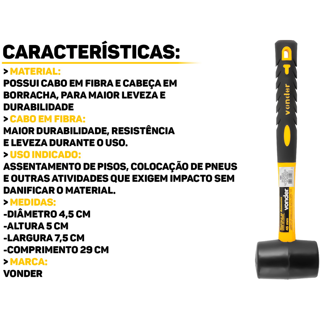 Martelo de Borracha Vonder O Martelo de Borracha Vonder é a ferramenta ideal para aplicações que exigem impacto sem danificar a superfície. Com cabeça de borracha de alta resistência, ele proporciona batidas suaves e controladas, sendo indicado para trabalhos em pisos, montagem de móveis, assentamento de peças cerâmicas e outras tarefas delicadas. Seu cabo em fibra de vidro garante maior durabilidade e resistência a impactos, além de ser leve, oferecendo conforto durante o uso prolongado. Características: > Cabo de fibra resistente e uma cabeça de borracha de 45mm; > Possui cabo em fibra, proporcionando maior leveza e durabilidade; > Indicado para diversas aplicações, como: assentamento de pisos, colocação de pneus, entre outros. Especificações Técnicas: > Diâmetro da cabeça: 45mm; > Material da cabeça: borracha; > Material do cabo: fibra de vidro. - Marca: Vonder - Garantia: 90 dias contra defeitos de fabricação Vantagens de comprar na Brester: - Produto a pronta entrega. - Produto novo, com garantia de fábrica. - Nota fiscal para Pessoa Física e Pessoa Jurídica.
