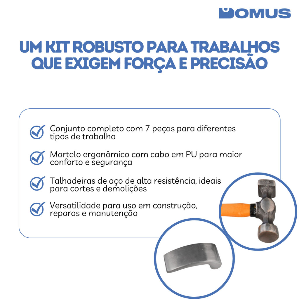 ***PRODUTO A PRONTO ENTREGA COM ENVIO IMEDIATO*** ITEM ORIGINAL COM NOTA FISCAL Somos a Domus, Loja oficial da Shopee. Temos 5 anos de experiência em E-Commerce e nosso maior objetivo é garantir a satisfação dos nossos clientes! Jogo Martelo e Talhadeira em Maleta com 7 Peças – Aço e PU – Bremen | Resistência e organização para serviços profissionais. O Jogo Martelo e Talhadeira Bremen é ideal para trabalhos de demolição, ajuste e cortes em superfícies diversas. Composto por 7 peças fabricadas em aço de alta resistência, inclui martelo, talhadeiras e acessórios, garantindo durabilidade e eficiência. Acompanha maleta prática para transporte e organização, tornando o kit perfeito para uso profissional e doméstico. Destaques do produto: 7 peças em aço resistente, ideais para cortes e demolições Martelo ergonômico com cabo em PU para maior conforto e segurança Maleta robusta para transporte fácil e organização das ferramentas Kit completo para uso em oficinas, construções e reparos gerais Informações técnicas: Marca: Bremen Modelo: Kit Martelo e Talhadeira Material: Aço de alta resistência e PU no cabo do martelo Quantidade: 7 peças Aplicação: Demolição, cortes e ajustes em superfícies duras Cor: Metálico com cabo preto Conteúdo da embalagem 1 Martelo com cabo em PU 6 Talhadeiras de diferentes medidas 1 Maleta plástica organizadora Produto original com garantia Garantia de 3 meses. Resistência, organização e eficiência para seus trabalhos. Adquira já o seu kit Bremen!