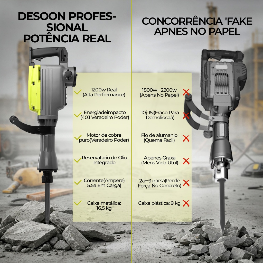 【Desempenho Potente, Eficiência Superior em Demolição】Este martelo hidráulico de alta resistência possui um potente motor de 1800W, que fornece até 65 joules de energia de impacto. Projetado para tarefas de alta intensidade, como reformas residenciais, demolição de paredes e pisos e abertura de estradas, ele conclui as tarefas de forma rápida e eficiente, economizando tempo e esforço. Construído em alumínio de alta qualidade, este martelo é durável e resistente ao uso diário intenso em ambientes agressivos. 【Cabo Giratório de 360° com Sistema Avançado de Absorção de Impacto】O martelo possui um cabo giratório de 360° totalmente ajustável, oferecendo operação flexível para se adaptar a vários ângulos e posições, atendendo a diferentes necessidades de trabalho. Um sistema avançado de absorção de impacto reduz significativamente a vibração, minimizando a fadiga das mãos e garantindo uma pegada mais estável e confortável, mesmo durante uso prolongado. Esse recurso aprimora a manobrabilidade, tornando o trabalho preciso mais fácil e eficiente ... 【Design Portátil, Armazenamento Conveniente】O kit de martelo de impacto inclui uma caixa de ferramentas resistente e durável, moldada por sopro, com rodas embutidas para facilitar o transporte. Seja para movimentar entre locais de trabalho ou guardar na oficina, esta caixa de ferramentas durável garante que seu martelo de impacto e acessórios estejam sempre organizados, seguros e confiáveis. O design com rodas aumenta ainda mais a portabilidade, permitindo que você o empurre facilmente para a posição desejada. 【SDS-Brocas Hexagonais, Design de Baixa Manutenção】O sistema de brocas hexagonais permite a troca de brocas sem ferramentas e apresenta travamento automático, proteção contra poeira e máxima transferência de energia de impacto. Para uso prolongado, o botão de travamento automático permite que você solte o botão de partida enquanto a máquina continua funcionando. O kit inclui escovas de carvão e lubrificante sobressalentes para facilitar a manutenção do desempenho da ferramenta a longo prazo, prolongando sua vida útil e reduzindo o tempo de inatividade. É uma escolha confiável para empreiteiros profissionais e entusiastas do faça-você-mesmo, combinando praticidade e economia. 📌Inclui: 1 cinzel pontiagudo 1 cinzel plano 1 lata de óleo plana 2 chaves hexagonais 1 chave inglesa 1 conjunto de escovas de carbono 📌 🪷ESPECIFICAÇÕES TÉCNICAS Tensão 220 V / 127V Corrente sem carga 3 A, com carga 5,5 A Taxa de impacto 1400 bpm Energia de impacto 40 J Reservatório de óleo interno Sim, reservatório de óleo Grau do lubrificante Graxa n.º 3, óleo para cilindros B035A Comprimento do cabo exposto 1,6 m Modelo do motor (Fio de cobre/fio de alumínio) Motor enrolado em série (fio de cobre)