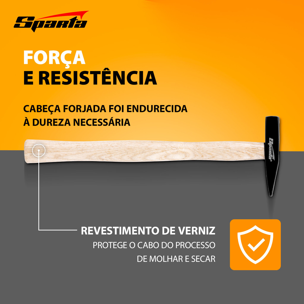Martelo Bola Sparta 1020256 Uma ferramenta leve, versátil e indispensável para trabalhos com metal, montagem de móveis e tarefas domésticas, oferecendo precisão e conforto em cada golpe. Principais Vantagens: Alta resistência e durabilidade: Cabeça forjada em aço médio carbono 45 com têmpera até 40–45 HRC, suportando uso intenso sem perda de desempenho. Fixação segura e confiável: Cabeça presa ao cabo com cunha e cola epóxi, garantindo firmeza mesmo em uso prolongado. Acabamento protetor: Revestimento de tinta preta na cabeça e verniz no cabo evitam danos por umidade e desgaste. Ergonomia e precisão: Cabo de madeira liso e confortável, com design que evita deslizamento e permite golpes precisos, mesmo em locais de difícil acesso. Ideal para profissionais da construção, montadores e entusiastas do faça você mesmo, o Martelo Bola Sparta 1020256 combina leveza, eficiência e durabilidade para entregar resultados consistentes em qualquer tipo de tarefa.