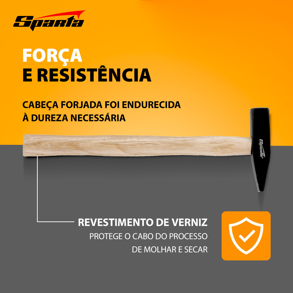 Martelo Bola Sparta 1020656 Martelo leve e versátil, ideal para fixações precisas, trabalhos em metal e tarefas detalhadas em locais de difícil acesso, sem causar fadiga em longas jornadas. Principais Vantagens: Alta durabilidade e resistência: Cabeça forjada em aço médio carbono 45, temperada até 40–45 HRC, garantindo robustez mesmo em uso intensivo. Fixação firme e segura: Cabeça presa ao cabo com cunhas e cola epóxi, oferecendo estabilidade e resistência prolongada ao desgaste. Proteção contra danos: Revestimento de tinta preta na cabeça e verniz no cabo protegem contra umidade e prolongam a vida útil da ferramenta. Conforto e ergonomia: Cabo de madeira liso e anatômico, proporcionando manuseio confortável, seguro e antiderrapante durante longos períodos de trabalho. Com leveza, precisão e robustez, o Martelo Bola Sparta 1020656 é ideal para profissionais e entusiastas do faça você mesmo que precisam de uma ferramenta eficiente e confortável para reparos, montagens e projetos variados.