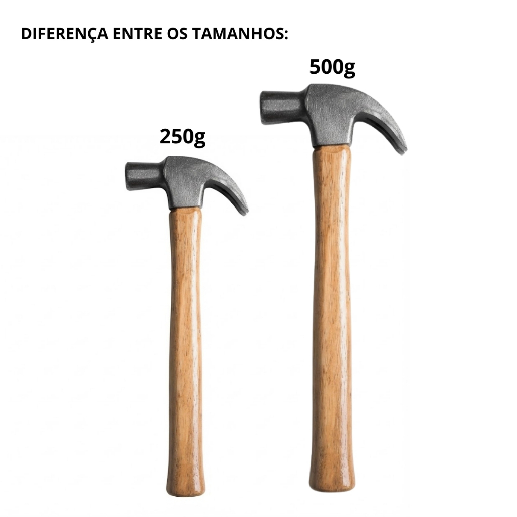Martelo robusto com cabeça de 500g. Ideal para carpintaria, marcenaria, construção civil e reparos domésticos. Ficha Técnica: Peso da Cabeça: 500g (Peso ideal para uso geral). Diâmetro do Batente: 29mm Material da Cabeça: Aço Carbono Forjado e Temperado. Tipo de Cabo: Madeira de Lei (Envernizada/Lixada). Tipo: Unha (Curvo) - Arranca pregos com facilidade. Fixação: Cabeça fixada com cunha para evitar soltura. Indicação de Uso: Introdução e remoção de pregos. Deslocamento de partes de madeira. Abertura de caixas e engradados. Conteúdo: 01 Martelo Cabo de Madeira 500g.