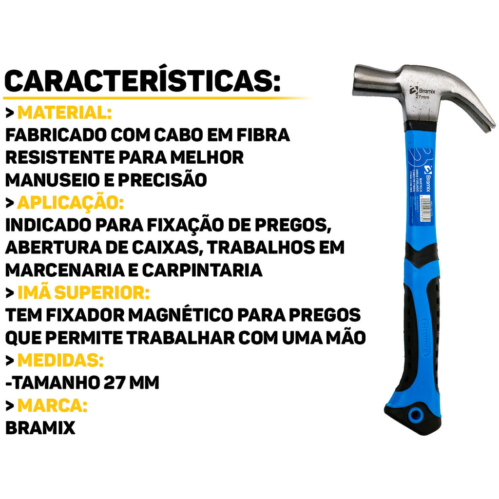 Martelo Unha Forjado Cabo De Fibra Com Imã 27mm Bramix O Martelo Unha da Bramix é a ferramenta para quem busca eficiência e durabilidade. Possui cabo fabricado em fibra de vidro, que garante leveza, resistência, e um manuseio confortável durante longas horas de trabalho. É ideal para diversas aplicações, como fixação de pregos, marcenaria e carpintaria. Características: > Possui cabo em fibra de vidro > Ideal para carpintaria, bricolagens e reparos domésticos, atendendo a diferentes necessidades; > Seu design ergonômico facilita o uso, tornando-o uma escolha prática e confiável para qualquer projeto; > A empunhadura em borracha proporciona uma aderência segura, aumentando a precisão de cada golpe. - Marca: Bramix - Garantia: 90 dias contra defeitos de fabricação Vantagens de comprar na Brester: - Produto a pronta entrega. - Produto novo, com garantia de fábrica. - Nota fiscal para Pessoa Física e Pessoa Jurídica.