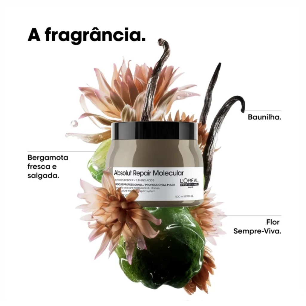Máscara Absolut Repair Molecular da L'Oréal Professionnel Série Expert, o tratamento intensivo que repara até 2 anos de danos em apenas 1 aplicação quando usado no sistema completo. Com 500ml de fórmula ultra-concentrada e sem enxágue parcial, esta máscara profissional age na estrutura molecular dos fios, reconstruindo cabelos extremamente danificados por químicas, calor, descoloração ou quebra. Benefícios principais: Reparação molecular patenteada: Com 2% de Peptide Bonder + 5 aminoácidos, penetra até 10 camadas da fibra capilar, reconectando ligações peptídicas rompidas e restaurando força, elasticidade e movimento natural. Hidratação profunda e brilho extremo: Textura cremosa e rica que nutre instantaneamente, desembaraça os fios e sela cutículas, deixando os cabelos sedosos, macios e com reflexos luminosos. Proteção térmica e durabilidade: Forma um escudo protetor contra danos futuros, ideal para cabelos fragilizados, coloridos ou com progressiva. Como usar: Aplique uniformemente nos cabelos úmidos, do comprimento às pontas. Deixe agir por 3 a 5 minutos e enxágue abundantemente. Para resultado profissional, use 1-2 vezes por semana