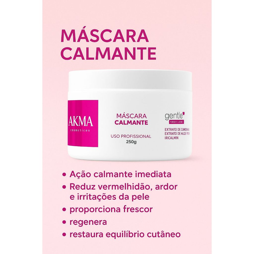 Máscara Calmante (250g) Indicada para finalizar tratamentos que possam sensibilizar a pele, proporcionando alívio, frescor e conforto imediato. Ideal para uso pós-limpeza de pele, pós-peeling, pós-depilação (com cera quente ou linha) e outros procedimentos que causem irritação ou vermelhidão. Ativos principais: -Extrato de Camomila: ação calmante e suavizante. -Extrato de Aloe Vera: hidrata e auxilia na regeneração da pele. -Iricalmin: reduz a sensibilidade e ajuda a restaurar o equilíbrio cutâneo. Resultado: pele calma, hidratada e visivelmente revitalizada.