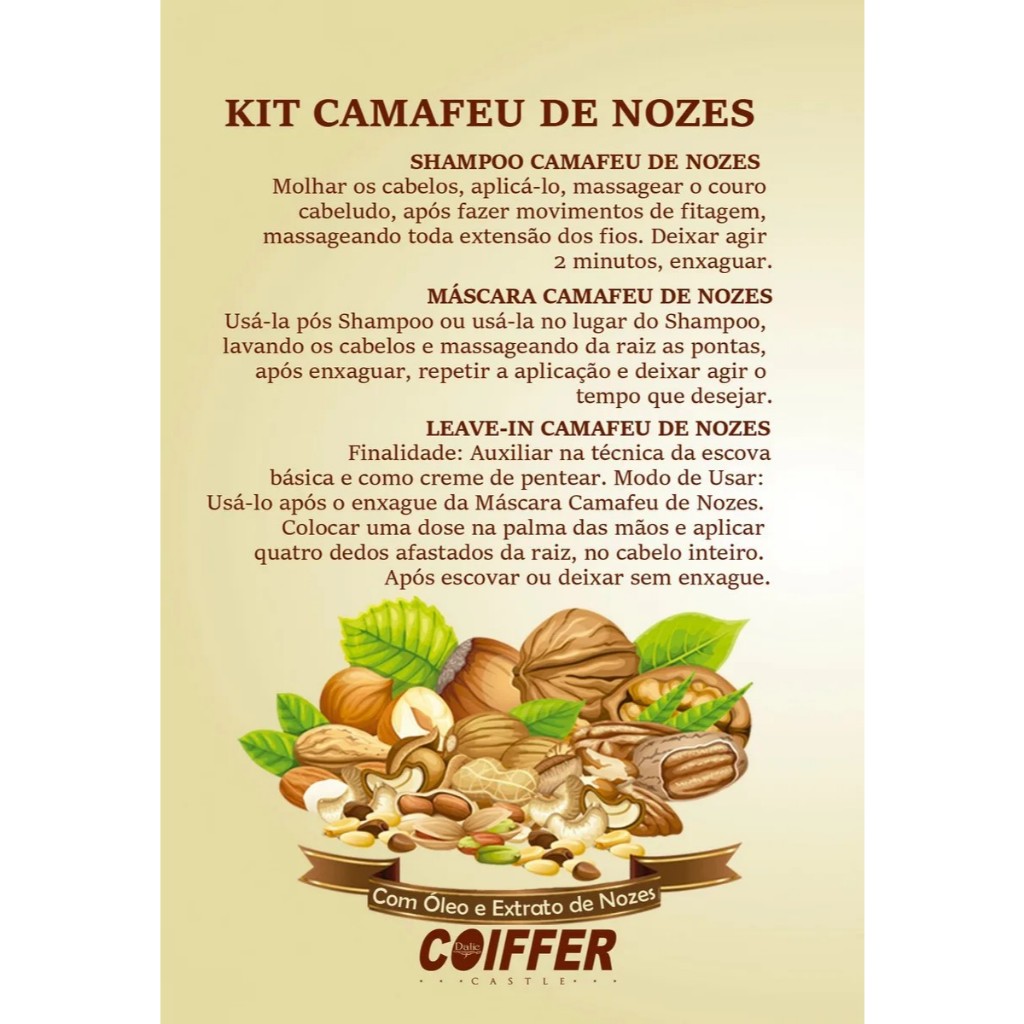 Máscara Camafeu de Nozes Coiffer 500g A Máscara Camafeu de Nozes Coiffer foi desenvolvida para auxiliar no fortalecimento e no crescimento dos fios, proporcionando cabelos mais saudáveis, resistentes e bem cuidados. Sua fórmula é rica em potássio e ômega 3, ativos que promovem hidratação intensa, nutrição profunda e ação umectante. Seu principal ativo, Carya Illinoensis Seed Oil, é uma poderosa fonte de potássio, essencial para a regeneração das células, ajudando a fortalecer a fibra capilar e a estimular o crescimento dos fios. Benefícios: Auxilia no fortalecimento e crescimento dos fios Rica em potássio e ômega 3 Hidrata e nutre profundamente Ação umectante Ajuda na regeneração da fibra capilar Cabelos mais fortes, macios e saudáveis Modo de uso: Após lavar os cabelos com shampoo, aplique a máscara em toda a extensão dos fios. Massageie, deixe agir por alguns minutos e enxágue. Ideal para quem busca cabelos mais fortes, hidratados e com crescimento saudável.