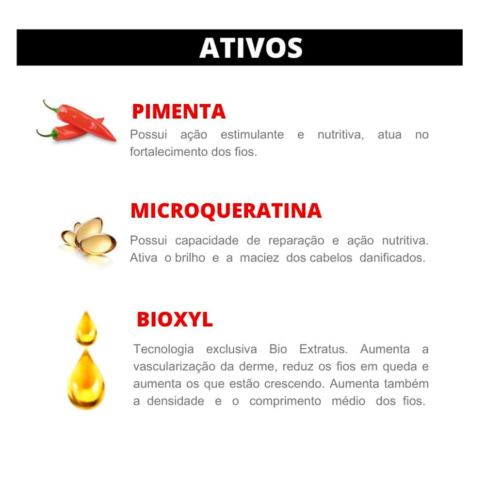 A Linha Bio Extratus Força com Pimenta foi criado com ativos que proporcionam uma hidratação e fortalecimento aos fios. A Bio Extratus uniu a tecnologia exclusiva Bioxyl ás propriedades da pimenta, que ativa a circulação sanguínea para estimular o crescimento do cabelo. Tudo isso ao poder reconstrutor da microqueratina. A linha ajuda no crescimento saudável do fio, deixando-os limpos e hidratados, conta com uma função que acelera o crescimento saudável devolvendo brilho e vitalidade ao cabelo enfraquecido. Indicado para todos os tipos de cabelo. A Máscara Hidratação Fortalecedora foi desenvolvida para promove uma hidratação fortalecedora no cabelo, reparando as áreas mais danificadas do fio, selando a cutícula devolvendo vitalidade e brilho ao cabelo. Com pH 4,0. Modo de usar: Pode ser usado diariamente. Após lavar o cabelo, aplique a máscara força com pimenta, massageando mecha a mecha. Para intensificar o tratamento use touca de hidratação. Deixe agir por 10 minutos. Enxágue. Sobre a marca: A Bio Extratus. Em 1997 a nossa produção já não era mais artesanal, éramos uma micro-empresa com uma marca cada vez mais forte e o nosso mercado ampliava. Foi neste período que a ousadia e visão de futuro dos proprietários superaram o medo das dificuldades e encorajaram a construção de uma nova fábrica, localizada no município de Alvinópolis a 170 Km da capital mineira. Em agosto de 1998 a Extratus Produtos Naturais passou a se chamar Bio Extratus Cosméticos Naturais. Como estratégia de crescimento, a marca prioriza a qualidade dos seus produtos e um relacionamento de valorização do público formador de opinião - os cabeleireiros. A Bio Extratus está presente em todo território nacional desde o início da década 90, com uma linha que cresce e se diversifica a cada ano, buscando realçar cada vez mais a beleza de seus cabelos.