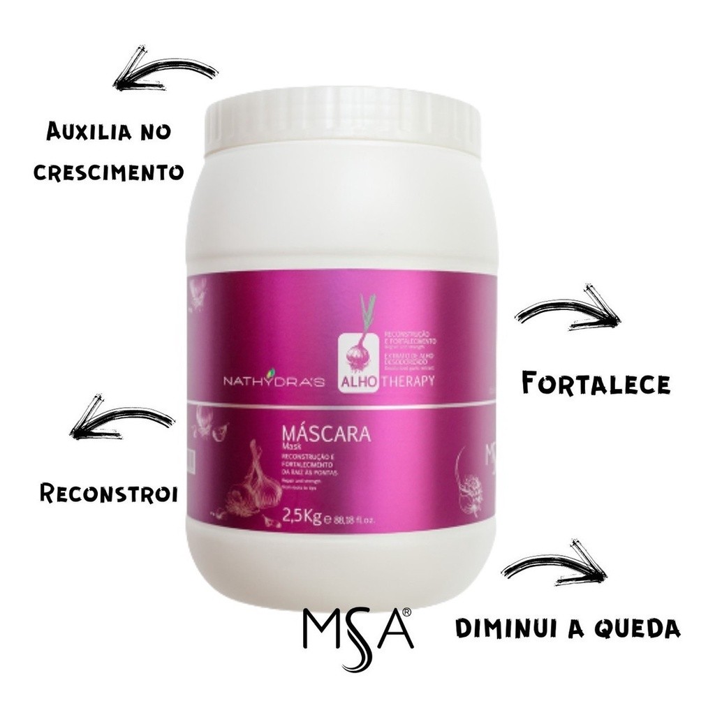 Máscara Alho 2,5kg – Reconstrução e Fortalecimento Indicado para cabelos: Danificados por processos químicos, físicos ou mecânicos. Itens: 1 Máscara 2,5kg A máscara Alho Therapy fortalece e auxilia no crescimento dos cabelos fracos e quebradiços, restaura os fios da raiz às pontas, proporciona selagem e maciez prolongada facilitando o pentear e diminui progressivamente a queda. Modo de uso: Após lavar o cabelo com Shampoo Alho Therapy, aplicar a Máscara Alho Therapy em todo comprimento e pontas do cabelo massageando até estar totalmente desembaraçado. Deixar agir de 5 a 10 minutos e enxaguar em seguida. Para melhor resultado sensorial condicionar as pontas com o Condicionador Alho Therapy. Benefícios: Reconstrução, Fortalecimento e Crescimento Saudável. Ativos: Extrato de Alho desodorizado, Filtro Solar. Resultado Esperado: Proteção da raiz às pontas, Fortalecimento, Crescimento Saudável. Precaução: Uso Externo. Mantenha fora do alcance das crianças. Em caso de alergia a qualquer um dos componentes da fórmula suspenda o uso. VALIDADE: 36 MESES