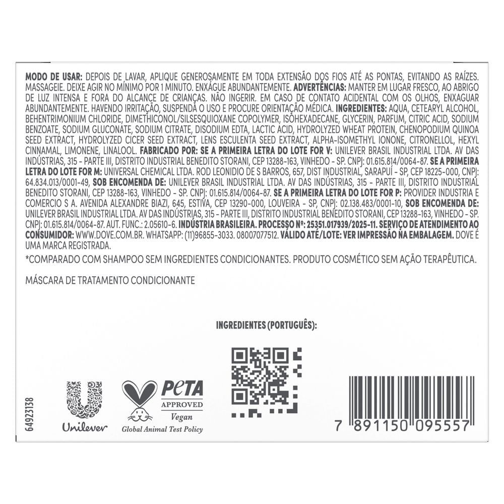 O que é e para que serve a Máscara de Tratamento Dove Bond Repair Reparação Intensa? A Máscara Dove Bond Repair Reparação Intensa é um tratamento capilar de alta performance desenvolvido para recuperar cabelos danificados por agressões químicas, térmicas e externas. Enriquecida com 12% de Peptídeo Complex, sua fórmula atua na reparação das ligações capilares a nível molecular, restaurando a estrutura dos fios e devolvendo a vitalidade desde o primeiro uso. Com tecnologia avançada, a máscara oferece 10 benefícios poderosos em um único produto: Repara danos profundos causados por processos químicos e calor; Restaura as ligações internas do cabelo para uma reparação intensa; Deixa os fios até 10 vezes mais fortes e resistentes à quebra; Proporciona maciez e toque sedoso instantaneamente; Promove hidratação e nutrição profunda da raiz às pontas; Ajuda a reduzir pontas duplas e prevenir novos danos; Controla o frizz e o volume excessivo; Confere brilho intenso e aspecto saudável; Devolve o movimento natural dos fios; Deixa o cabelo com aparência leve e relaxada. Como usar a Máscara de Tratamento Dove Bond Repair Reparação Intensa? Após lavar os cabelos com o shampoo e condicionador da linha Dove Bond Repair, aplique a máscara generosamente em todo o comprimento e pontas, evitando a raiz. Massageie bem e deixe agir por, no mínimo, 1 minuto. Enxágue abundantemente para retirar todo o produto e finalize como desejar. Advertências Uso externo. Não ingerir. Em caso de contato com os olhos, enxágue imediatamente com água em abundância. Se ocorrer irritação, suspenda o uso e procure orientação médica. Mantenha o produto fora do alcance de crianças. Experimente a Máscara Dove Bond Repair Reparação Intensa e descubra o poder de um cabelo forte, saudável e com brilho de salão todos os dias. Informações Adicionais do Fabricante Dove Máscara Bond Intense Repair + Peptídeos é uma investigação capilar intensa que trata fios profundamente danificados com benefícios visíveis em 1 minuto* •Máscara para etapa de investigação no cronograma com 12% de Peptídeo Complex que fortalece a fibra capilar e repara as ligações internas deixando os fios até 10X mais fortes* •Tratamento profundo com peptídeos para fios danificados que reduz pontas duplas, controle o frizz e promove brilho e maciez desde as primeiras aplicações •Formulado com a tecnologia Bio-Protein, resultado de mais de 10 anos de pesquisa, que repara, regenera e protege 90% da estrutura proteica do fio •Máscara Capilar 10 em 1 Bond Intense Repair + Peptídeo fortalece a fibra capilar, o creme reparador conta com textura cremosa que desembaraça facilmente e potencializa os resultados da linha completa • Indicada para todos os tipos de cabelo danificado, pode ser usada semanalmente ou na etapa de hidratação do cronograma capilar Dove Máscara Capilar 10 em 1 Bond Intense Repair + Peptídeo é a escolha ideal para quem busca uma máscara capilar intensa com ação visível em apenas 1 minuto*. Sua fórmula poderosa trata profundamente os cabelos danificados, devolvendo resistência, brilho e maciez desde as primeiras aplicações. Com 12% de Peptídeo Complex e a exclusiva Tecnologia Bio-Protein, desenvolvida ao longo de mais de 10 anos de pesquisa, Dove oferece um tratamento profundo com peptídeos para fios danificados que atuam a nível molecular. Essa tecnologia repara ligações internas e regenera até 90% da estrutura proteica dos fios, deixando os cabelos até 10x mais fortes*. A máscara entrega 10 benefícios em 1 minuto*, repara danos térmicos e químicos, hidrata, condiciona e nutre profundamente. Além disso, ela recupera a maleabilidade, reduz pontas duplas, controla o frizz, promove brilho extra, 100% mais maciez e a desejada sensação de fios desmaiados. Indicada para todos os tipos de cabelos danificados, essa máscara capilar pode ser usada semanalmente ou na etapa de planejamento do cronograma capilar. Sua textura cremosa facilita o desembaraço e potencializa os resultados quando combinada ao shampoo, condicionador e finalizadores da linha Dove Bond Intense Repair + Peptídeo. *Com o uso do shampoo e condicionador da linha, em comparação com shampoo sem ingredientes condicionantes.