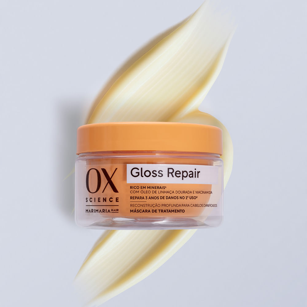 A Máscara Capilar OX Science Gloss Repair 180g foi desenvolvida para oferecer reconstrução profunda e devolver a vitalidade dos fios danificados. Com fórmula rica em minerais, óleo de linhaça dourada e niacinamida, ela atua desde a primeira aplicação, reparando até 3 anos de danos em apenas um uso. Além de nutrir intensamente, promove brilho radiante, maciez e movimento natural, deixando o cabelo saudável e resistente. Benefícios:Reconstrução profunda para cabelos danificados;Repara até 3 anos de danos já no primeiro uso;Restaura a força, elasticidade e brilho dos fios;Fórmula rica em minerais e ativos de alta performance;Redução do frizz e das pontas ressecadas.Ativos Principais:Óleo de Linhaça Dourada: rico em ômegas e antioxidantes, nutre e fortalece os fios;Niacinamida: vitamina essencial que auxilia na reparação e na proteção da fibra capilar;Minerais Essenciais: ajudam a revitalizar os fios e melhorar a saúde capilar.Modo de usar: Após lavar os cabelos com shampoo, aplique a máscara nos fios úmidos, do comprimento às pontas. Massageie suavemente e deixe agir de 3 a 5 minutos. Enxágue bem. Utilize de 1 a 2 vezes por semana, conforme a necessidade dos cabelos. Sobre a marca: OX Cosméticos está presente no mercado brasileiro desde 1995, oferecendo cuidado capilar de alta performance e hoje possui um portfólio composto por shampoo, condicionador e máscara de tratamento. OX acredita que o essencial é o que fica. Por isso, a fórmula conta o Sistema OX Beleza Duradoura, tecnologia internacional exclusiva que promove hidratação acumulada e duradoura.