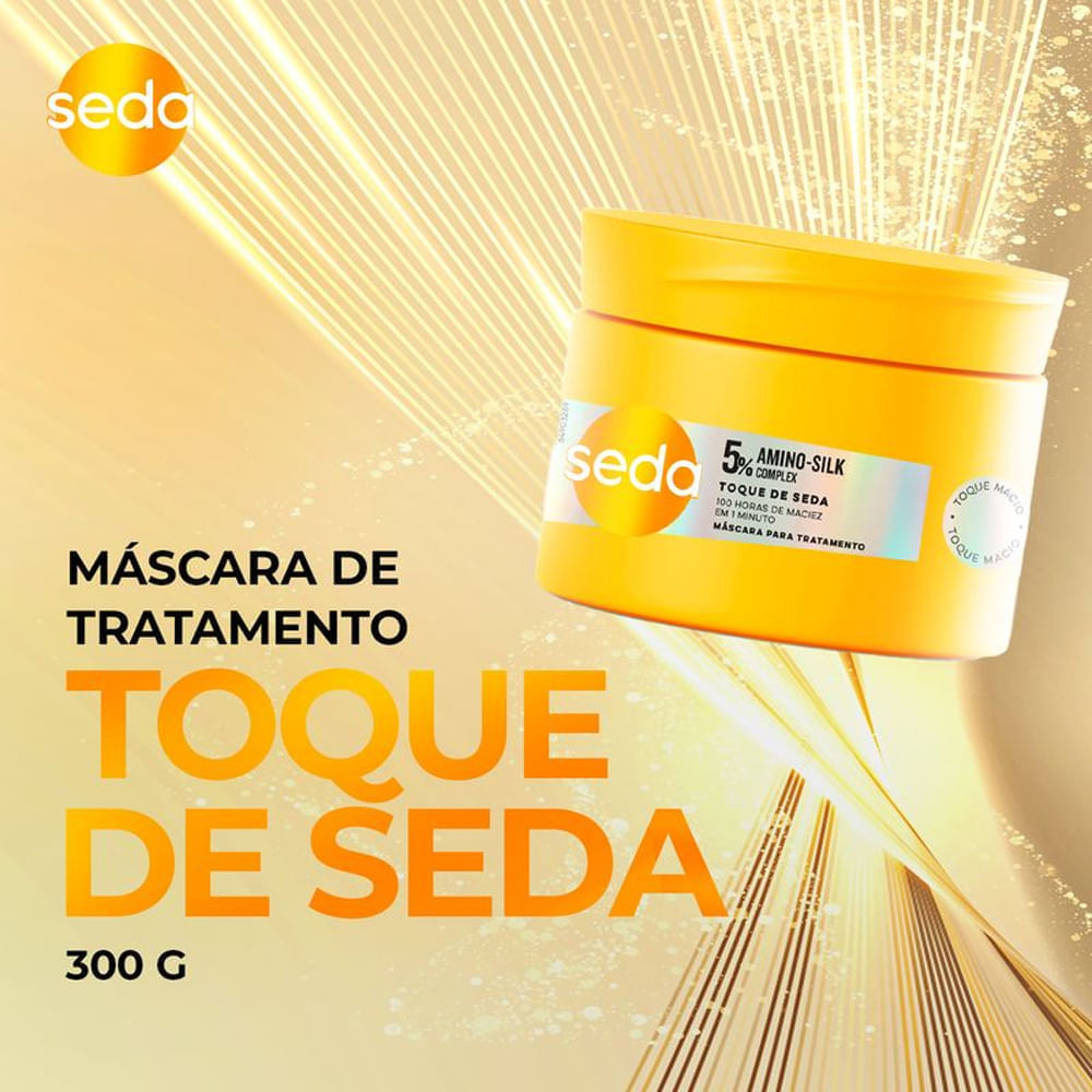 • Máscara de tratamento com fórmula enriquecida com 5% Amino-Silk Complex. • Amino-Silk Complex é um complexo que se conecta com as fibras capilares, resultando em um cabelo com fios mais fortes e com toque macio. • Cabelos 100% mais sedosos e controle de frizz imediato* • Cabelos mais macios por 1 semana*. • 0,1 minuto de tratamento para 100h de maciez*. • 100h de maciez e adeus ao frizz*. A máscara capilar Toque de Seda é uma excelente opção para quem busca cabelos sedosos e sem frizz. Sua fórmula é enriquecida com 5% de Amino-Silk Complex, um poderoso mix com a proteína da seda, que se conecta com as fibras capilares, resultando em um cabelo mais forte e com toque macio. Ela é perfeita para uso diário, apenas 1 minuto de tratamento para 100h de maciez* sem deixar o cabelo pesado. Com essa máscara de tratamento poderosa, é possível obter cabelos 100% mais sedosos e controle imediato do frizz*. MODO DE USO: Com os cabelos úmidos, aplique o creme de tratamento em toda a extensão dos cabelos até as pontas (evitando a raiz!), trabalhando de cima para baixo, mecha por mecha. Deixe agir por 1 minuto e depois enxágue. Experimente toda a linha SEDA Toque de Seda, um regime completo para todos os tipos de cabelo. Combine o uso da máscara com os outros produtos de cabelo da linha Toque de Seda e descubra um regime completo para cabelos macios por 1 semana*. Essa linha foi desenvolvida para proporcionar força, maciez e alinhamento, além de facilitar o controle do frizz. Cada produto da linha complementa os outros, tornando o cuidado capilar uma experiência eficaz e transformadora. *com uso da linha completa vs shampoo sem agentes condicionantes