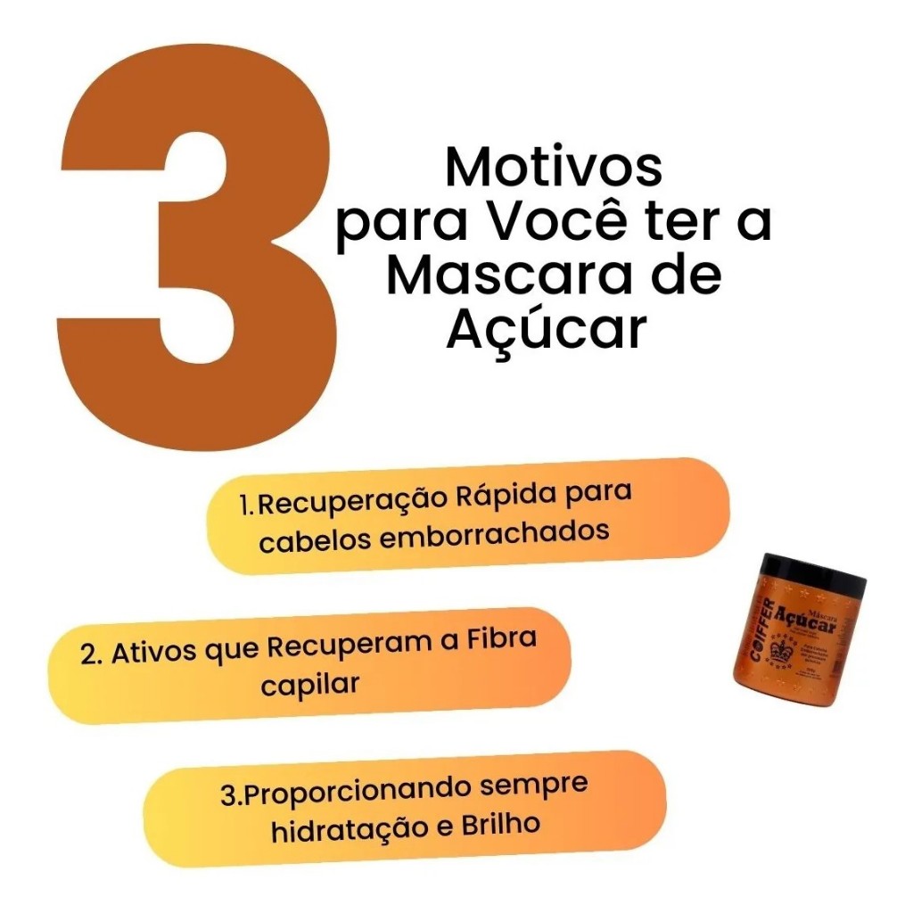 Máscara de Açúcar Coiffer 500g A Máscara de Açúcar Coiffer foi desenvolvida especialmente para cabelos elásticos e emborrachados por processos químicos, ajudando na recuperação da estrutura capilar. Seu principal ativo é a sacarose, molécula encontrada em abundância na cana-de-açúcar, conhecida por sua ação restauradora e fortalecedora. A fórmula atua na reposição de resistência da fibra capilar, devolvendo maciez, brilho e elasticidade saudável aos fios danificados. Proporciona resultados visíveis, com recuperação de até 70% dos cabelos elásticos e emborrachados. Benefícios: Indicada para cabelos elásticos e emborrachados Auxilia na recuperação da fibra capilar Devolve resistência aos fios Proporciona maciez e brilho Ajuda a reduzir a elasticidade excessiva Resultados de recuperação de até 70% Modo de uso: Após lavar os cabelos com shampoo, aplique a máscara em toda a extensão dos fios. Massageie, deixe agir por alguns minutos e enxágue. Ideal para quem busca tratamento intensivo e recuperação dos cabelos danificados por química.