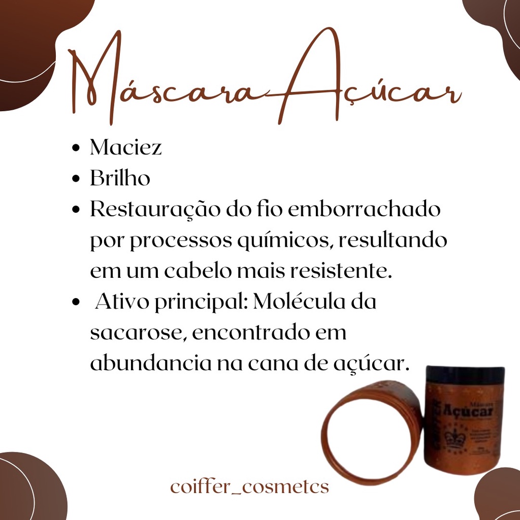 A Máscara Açúcar Coiffer penetra profundamente no córtex para reparação do substrato proteico danificado, onde se encontra a cistina e arginina. É rico em enzimas lacto, que condicionam e hidratam o substrato dos cabelos elásticos, fortalecendo-os, interrompendo o rompimento dos fios, por excessiva elasticidade. Além de tirar o emborrachado, tira o amarelado dos fios dando uma cor mais uniforme para destacar mais ainda seus cabelos loiros ou mechados. Composição: Contém Ácido Láctico (Retirado do Leite) é uma componente orgânico de ácido carboxílico + Aminoácidos. Açúcar, além de contém vitaminas e minerais essenciais para os fios dão uma beleza maior além de proteger contra os danos das químicas e descolorantes.