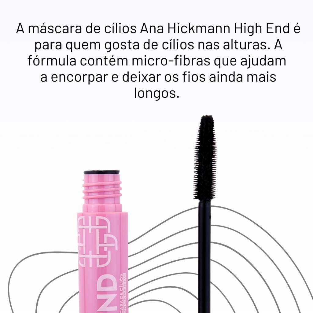 A máscara de cílios Ana Hickmann High End é para quem gosta de cílios nas alturas. A fórmula contém micro-fibras que ajudam a encorpar e deixar os fios ainda mais longos. Resistente à água, remova com uso de demaquilante. Alongamento, fórmula com fibras que encorpam e alongam ainda mais os fios. Modo de uso: Aplique nos cílios da raiz em direção às pontas, em movimento de ziguezague. Para removê-la por completo, recomendamos o uso de demaquilante à base de óleo ou bifásico. Aqua/Água, Acrylates/Octylacrylamide Copolymer/Copolímero de Acrilatos/Octilacrilamida, Propylene Glycol/Propileno Glicol, Microcrystalline Wax/Cera Microcristalina, Stearic Acid/Ácido Estárico, Copernicia Cerifera Wax/ Cera de Carnaúba, Silica/Sílica, Steareth-21/Estearete-21, Dimethicone/Dimeticona, Polysorbate 80/Polisorbato 80, Sorbitan Sesquioleate/Sesquioleato de Sorbitana, PVP/Poli Vinil Pirrolidona, Nylon-66/Náilon-66, Triethanolamine/Trietanolamina, Phenoxyethanol/Fenoxietanol, Caprylyl *Produto Vegano*