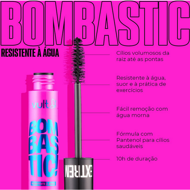 Máscara de Cílios Vult Extreme Bombastic! Resistente à Água 10g A nova Máscara de Cílios Vult Extreme Bombastic! Resistente à Água traz um destaque bombástico e resistente para o seu olhar, transmitindo mais segurança e autoconfiança. Ideal para quem adora uma maquiagem pigmentada e duradoura, a Máscara Extreme Bombastic! Resistente à Água eleva suas produções com tecnologia e performance ao extremo. De cara nova, esta máscara proporciona mais volume e mais curvatura por meio de um ultra alongamento que deixará seus cílios lindos. Com um efeito bombástico, oferece cílios mais volumosos da raiz às pontas, deixando-os uniformes no alongamento. Pensando no cuidado com seus cílios, esta máscara contém pantenol, vitamina E e óleo de coco, ativos que oferecem benefícios para a saúde dos seus cílios. Em uma pigmentação super preta, garante até 10h de duração, sendo ideal para a rotina ou qualquer tipo de evento. Mesmo resistente à água, possui fácil remoção com água morna. Cansou de precisar repor a máscara e não ter um olhar destacado? Com a nova Máscara de Cílios Vult Extreme Bombastic Resistente à Água você vai arrasar aonde quer que chegue sem se preocupar com diversas reposições. Nenhum produto Vult é testado em animais, ou seja, este item possui selo Cruelty Free.