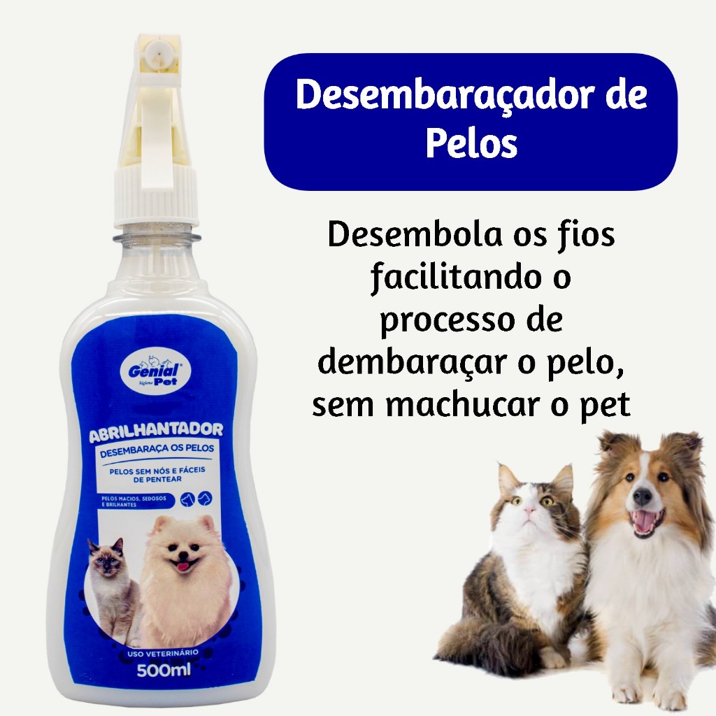 1 Máscara de Hidratação Intensiva para Pets – Equilíbrio e Sinergia para Pelos Saudáveis 1 Fluído Desembaraçador Abrilhantador Genial Pet 500ml Máscara de Hidratação Intensiva Nossa fórmula inovadora combina silicones 1784 e 2034, que proporcionam condicionamento e proteção, com um blend poderoso de ativos naturais e vitaminas essenciais. Extratos de Aloe Vera, Jojoba e Hamamelis – Hidratação profunda, fortalecimento e ação calmante para a pele dos pets. Vitaminas A e E – Poderosos antioxidantes que restauram a vitalidade dos pelos e protegem contra danos ambientais. Manteiga de Karité – Nutrição intensa e reparação para pelagens ressecadas e sem brilho. Queratina – Fortalecimento da fibra dos pelos, proporcionando resistência e brilho duradouro. Essa sinergia de ingredientes garante um tratamento completo, promovendo hidratação equilibrada, fortalecimento e proteção, deixando a pelagem dos pets mais saudável, macia e radiante. Ideal para tutores que buscam um cuidado premium, com tecnologia avançada e ativos naturais que respeitam a saúde e o bem-estar dos animais 1 Fluído Desembaraçador Abrilhantador Genial Pet 500ml ✅ Indicado para cães e gatos; ✅ Desembaraçador concentrado; ✅ Abrilhantador ( Abrilhanta e Ilumina) ✅ Com ótima ação em qualquer tipo de pelagem; ✅ Contém extrato de Aloe Vera e Silicone para uma hidratação profunda; ✅ Disponível em embalagem de 500ml; ✅ Com gatilho spray para facilitar o uso. Desembaraçador Abrilhantador para Cães e Gatos 500ml, para Cães e Gatos é um produto de cuidado para pets que ajuda a manter o pelo saudável e brilhante. Com uma fórmula suave e eficaz, é ideal para todos os tipos de pelos, principalmente para pelagens longas ou encaracoladas. ✨Benefícios do produto ✅ Desembaraça e facilita a penteabilidade*: O produto ajuda a desembaraçar o pelo do pet, facilitando a penteabilidade e acabando a quantidade de nós e emaranhados. ✅ Abrilhanta e ilumina: O produto além de desembaraçador conta com o abrilhantador que Desembaraça, abrilhanta e ilumina o pelo do pet, deixando-o com um aspecto saudável e brilhante. ✅ Hidrata e nutre: Contém extrato de Aloe Vera e Silicone, para uma hidratação profunda