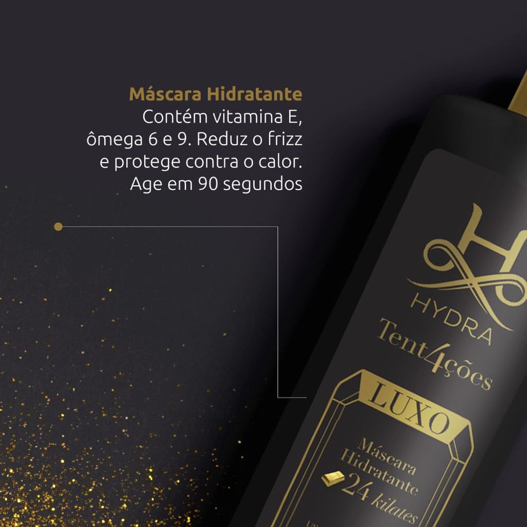 A Máscara Hidratante Hydra – Luxo 24 Kilates é enriquecida com vitamina E e ômegas 6 e 9, que proporcionam ação condicionante, emoliente e redutora de frizz. Contém ativo termo protetor que protege a pelagem dos danos causados pelo calor. Modo de Usar: Banhe o animal com o Shampoo Hidratante Luxo e enxágue. Se o animal estiver muito sujo, faça a pré-lavagem com o Hydra Shampoo Neutralizador de Odores. Aplique o produto, massageando bem no sentido do crescimento dos pelos. Deixe agir por 2 minutos e enxágue. Finalize com a Colônia Forever Gold. Apresentação: Frascos de 900g.