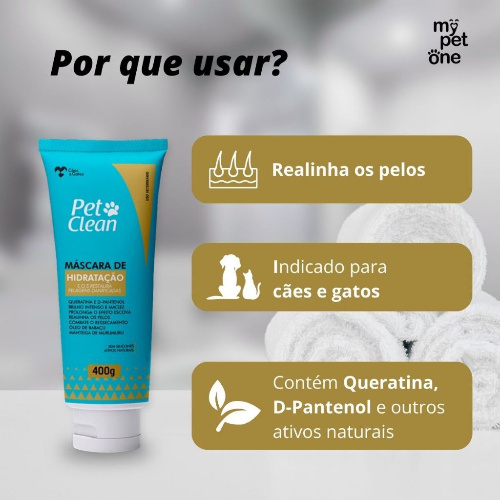Máscara de Hidratação Pet Clean para Cães e Gatos - 400g – Indicado para cães e gatos; – Hidrata a pele e pelos; – Restaura pelagens danificadas; – Prolonga o efeito escova; – Realinha os pelos; – Contém queratina, D-Pantenol e outros ativos naturais. Detalhes A Máscara de Hidratação Pet Clean - 400g, foi desenvolvida para restaurar a pelagem de cães e gatos. Possui uma formulação super hidratante com D-pantenol e manteiga de murumuru que combate o ressecamento, queratina e óleo de pracaxi, para manter os pelos alinhados e o óleo de babaçu que promove maciez e brilho. Além disso auxilia no desembaraço, diminui tempo de secagem e prolonga o efeito escova finalizando com um perfume maravilhoso para o seu pet. Dicas Especiais Banho: Após lavar o animal com o shampoo adequado, remova o excesso de água com uma toalha. Aplicação: Aplique a Máscara de Hidratação em toda a pelagem do animal, massageando suavemente para garantir que o produto seja distribuído uniformemente. Evite aplicar próximo aos olhos e mucosas. Tempo de Ação: Deixe a máscara agir conforme as instruções do fabricante, geralmente de 5 a 10 minutos. Isso permite que os ingredientes hidratantes e nutritivos penetrem nos pelos e na pele. Enxágue: Enxágue completamente para remover todo o produto. Certifique-se de que não haja resíduos de máscara na pelagem do animal. Secagem: Seque o animal com uma toalha ou secador, conforme preferência e necessidade. A máscara deve ajudar a reduzir o tempo de secagem e facilitar o desembaraço. Finalização: Após secar, finalize conforme desejado. A máscara pode ajudar a manter os pelos alinhados e com brilho, além de deixar um perfume agradável. Indicação: Cachorros, Gatos Porte/Raça: Raças Pequenas, Raças Médias, Raças Grandes Idade: Filhotes, Adultos, Idosos Composição: D-pantenol: Um derivado da vitamina B5, conhecido por suas propriedades hidratantes e regenerativas para pele e pelos. Manteiga de murumuru: Rica em ácidos graxos e antioxidantes, ajuda a combater o ressecamento e proporciona nutrição intensa. Queratina: Proteína que fortalece e protege os pelos, ajudando a manter sua integridade e resistência. Óleo de pracaxi: Conhecido por suas propriedades emolientes, ajuda a manter os pelos alinhados e a pele nutrida. Óleo de babaçu: Promove maciez, brilho e ajuda na hidratação da pelagem. Apresentação: 400g