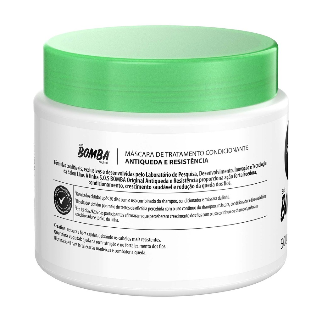 Fim da queda, cabelos fortes e saudáveis O que você precisa saber? A Máscara Hidratante S.O.S Bomba Antiqueda combate a queda de cabelo, a quebra e as pontas duplas. Sua fórmula hidrata profundamente, ajudando na reconstrução capilar, além de fortalecer os fios danificados e quebradiços, proporcionando força e saúde. INDICAÇÕES Para quais tipos de cabelo? Para todos os tipos de cabelo. Qual a indicação? Cabelos fragilizados e cabelos danificados. Pode usar a partir de quantos anos? A partir de 12 anos. ATIVOS Quais os principais ativos? Creatina: restaura a fibra capilar, deixando os cabelos mais resistentes. Queratina vegetal: reconstrói os fios, deixando-os fortes e saudáveis. Biotina: vitamina do complexo B,ideal para fortalecer as madeixas e combater a queda de cabelo. MODO DE USO Qual a melhor forma de usar? Com o cabelo molhado, aplique a Máscara Hidratante S.O.S Bomba Antiqueda mecha a mecha, enluvando os fios da raiz às pontas. Deixe agir entre 3 e 5 minutos e enxágue. Dicas de uso Para melhores resultados, utilize o Shampoo Bomba, o Condicionador Antiqueda e tônico fortalecedor da linha S.O.S Bomba Antiqueda da Salon Line. CARACTERÍSTICAS É produto vegano? A Máscara Hidratante S.O.S Bomba Antiqueda é vegana. É liberado? A Máscara Hidratante S.O.S Bomba Antiqueda não é iberada.