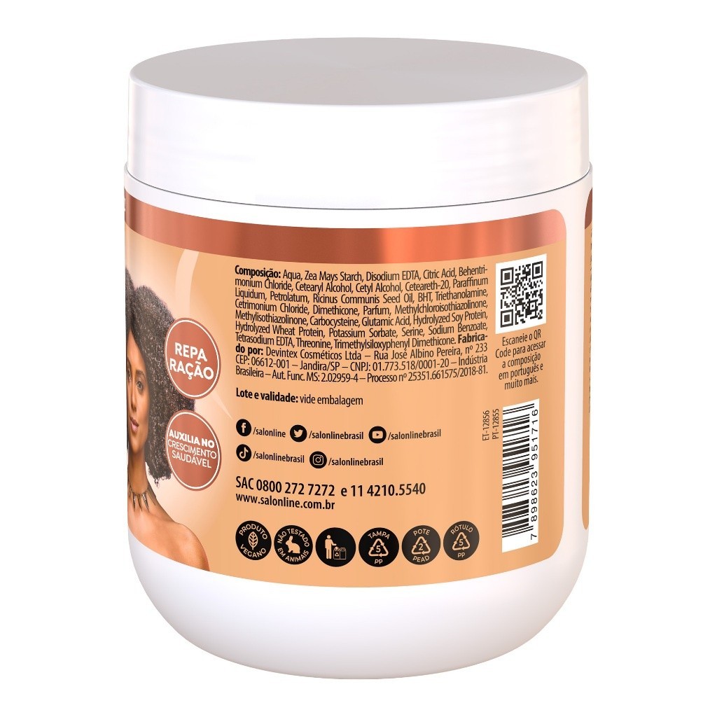 A Máscara de Hidratação Intensa Rícino e Queratina Reparação Extrema 5 em 1 S.O.S Cachos possui fórmula concentrada para um cuidado intenso, garantindo nutrição, hidratação, reconstrução, força e brilho extremo para cachos e crespos. INDICAÇÕES Para quais tipos de cabelo? Cabelos cacheados e cabelos crespos. Qual a indicação? Cabelos ressecados, cabelos fragilizados, cabelos quebradiços e danificados. Pode usar a partir de quantos anos? A partir de 12 anos. ATIVOS Quais os principais ativos? Óleo de rícino: rico em ácidos graxos, vitaminas e sais minerais, possui propriedades que restauram e hidratam os fios, além de oferecer cuidados para um couro cabeludo saudável. Queratina: excelente para uma reconstrução capilar profunda, devolve os nutrientes que o cabelo perde ao longo do tempo. MODO DE USO Qual a melhor forma de usar? Após lavar o cabelo, aplique a máscara de hidratação mecha por mecha, massageando no sentido da raiz para as pontas. Deixe agir de 3 e 5 minutos. Enxágue. Dicas de uso Se desejar hidratar ainda mais, deixe a Máscara de Hidratação agir por 15 minutos na touca térmica para cabelo e depois enxágue. Salon Line recomenda Para melhores resultados, use a linha completa S.O.S Cachos da Salon Line. CARACTERÍSTICAS É produto vegano? A Máscara de Hidratação S.O.S Cachos Rícino e Queratina não é vegana. É liberado? A Máscara de Hidratação S.O.S Cachos Rícino e Queratina não é liberada.