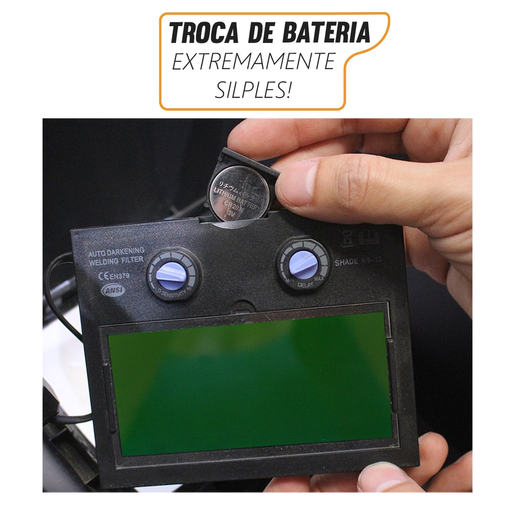 Máscara de Solda com Escurecimento Automático Soldador Profissional 3 Regulagens Pró Euro Recomendada para todos os tipos de soldagem MMA,TIG, MIG/MAG e PLASMA e até serviços com esmerilhadeira. Soldagem em Geral até 350A DIFERENCIAIS: Tripla regulagem: Sensibilidade, Delay, e Tonalidade Carneira ajustável a cabeça Escurecimento automático Carregador solar de bateria Visor de polietileno Super confortável, com carneira ajustável, testeira estofada e suporte emborrachado Pesa apenas 630g Máscara já vai com bateria de Íons de Lítio - CR2032 (igual de relógio) DESCRIÇÃO TÉCNICA: Área de visualização: 93 x 43 mm Dimensão do filtro: 110 x 90 x 9 mm Estágio claro: DIN 4 Estágio escuro: DIN 9 - 13 Tempo de resposta: 0,0001s Proteção UV/Infravermelho: DIN 13 Temperatura de proteção: - 5°C ~ 55°C Temperatura de armazenagem: - 20°C ~70°C Variação DIN 4 (estágio claro) ao DIN 13 (estágio escuro) Bateria: Íons de lítio CA: 49.183 SUGESTÕES DE USO: SMAW – Soldagem por eletrodo revestido MIG (Pesado) – MIG em materiais pesados MIG (Leve) – MIG em materiais leves TIG, GTAW – Processo de soldagem TIG MAG/CO2 – Soldagem com arco metálico e gás de proteção ativo SAW – Soldagem por arco submerso PAC – Processo de corte plasma PAW – Processo de soldagem plasma