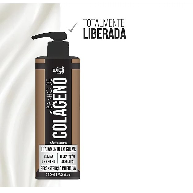 Máscara de Tratamento de Reconstrução Intensiva Banho de Colágeno 280ml - Widi Care Sobre o produto: Devido à pandemia e a falta de tampas no mercado brasileiro, este produto pode sofrer alguma alteração em sua tampa original. Caso aconteça, a tampa substituta de nada interferirá no uso do produto e em sua composição. Tratamento para restauração de cabelos altamente danificados, ressecados, enfraquecidos e necessitados de cuidados especiais. Sua fórmula, a base de colágeno vegetal, foi desenvolvida com alta tecnologia que protege os fios contra a quebra e a queda. Proporciona rejuvenescimento, resistência e condicionamento. Aumenta a elasticidade e a sustentação capilar. Seus ativos umidificam profundamente a fibra, com ação ultra hidratante e protetora da membrana celular dos cabelos. Agente extremamente eficiente em promover brilho. Modo de Usar: Aplique o shampoo sobre o cabelo molhado. Massageie suavemente o couro cabeludo e enxágue. Caso necessário, repita o procedimento. Prossiga o tratamento utilizando a máscara banho de colágeno. Ingredientes: Aqua (Water) - Cetearyl Alcohol - Stearamidopropyl Dimethylamine - Propylene glycol - Isopropyl Myristate – Cetrimonium Chloride - Helianthus Annus (Sunflower) Seed Oil (Óleo de Semente de Girassol) - Butyrospermum Parkii Butter - Acacia Senegal Gum Extract (Colágeno Vegetal) - Ginkgo Biloba Leaf Extract (Extrato de Ginkgo Biloba) - Sodium PCA / Sodium Lactate / Arginine / Aspartic Acid / PCA / Glycine / Alanine / Serine / Valine / Proline / Treonine / Isoleucine / Histidine / Phenylalanine / Water - Latic Acid - Disodium Edta – BHT - PEG 180M – Phenoxyethanol – Methychloroisothiazolinone / Methylisothiazolinone – Parfum (Fragance) – Linalool / Limonene / Geraniol / Benzyl Benzoate / Citral / Benzyl Salicylate / Farnesol – Isoeugenol / Eugenol / Citronellol.